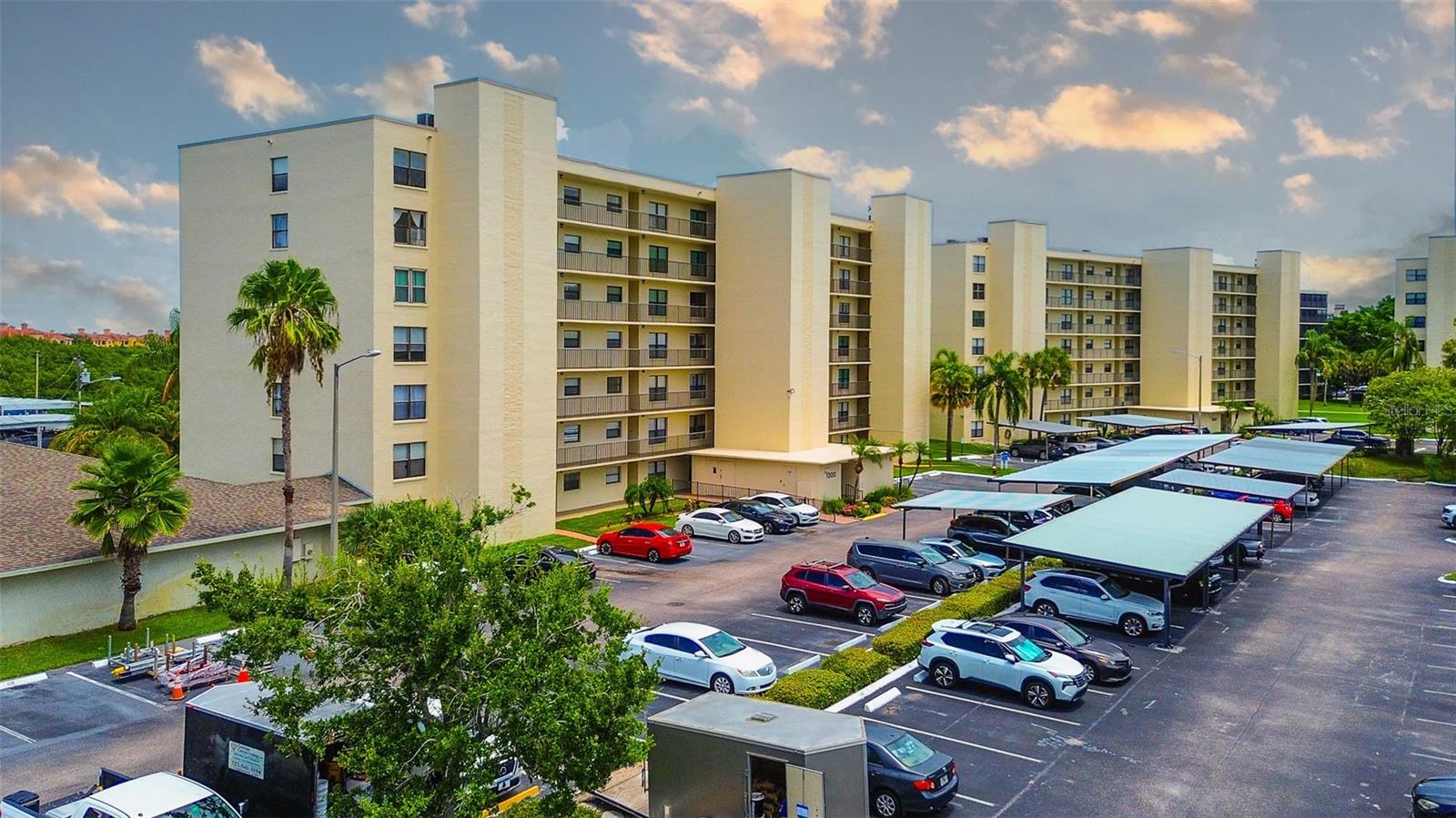 Daily life here is streamlined: you have an assigned covered carport plus additional open/guest options, and the residence sits on one easy level for comfortable access. Solid construction—block, concrete, and stucco on a slab with a built-up roof—adds peace of mind.