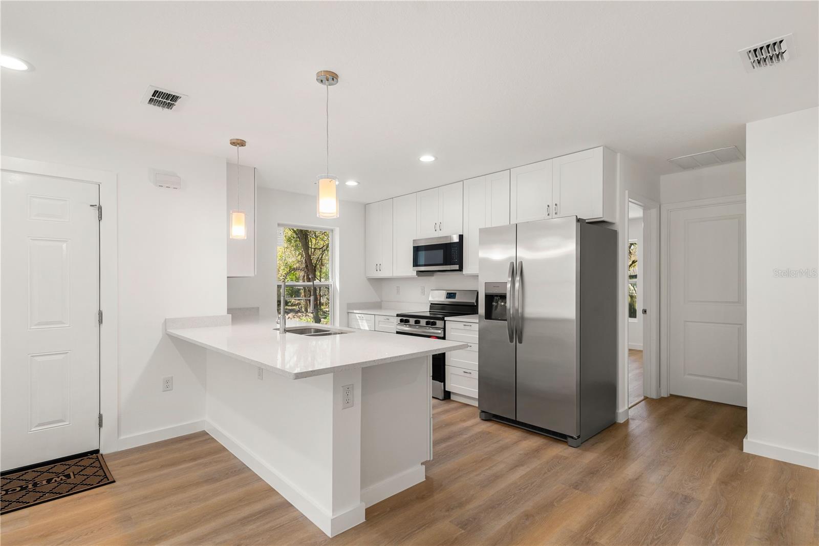 One or more photo(s) has been virtually staged. REDUCED AND OFFERED AT ITS MOST COMPETITIVE PRICE BY THE BUILDER. Affordable new construction home on a DOUBLE LOT! 0.36 acres offers endless possibilities for storage, parking, or building your ideal yard project. Fully completed and available now! Investors: potential rental income for this home is approximately $2,150/month. Buyers: Limited opportunity to keep costs down, making your mortgage cheaper than renting long term. As with all new construction homes, the home insurance premium is much lower than older homes. With a brand-new private well system, you'll also have no water/sewer bills, and being out of a high-risk flood zone, flood insurance is NOT required! No HOA here either, allowing you to maximize your property at your leisure. This builder prioritizes energy efficiency by using superior insulation, low-E windows, recessed LED lighting and ceiling fans which enhance comfort throughout. Two exterior 110-V soffit outlets for easy installation of security cameras. Offering 3 bedrooms, 2 bathrooms, and a thoughtfully designed open layout. Enjoy peace of mind with impact-resistant windows and exterior doors rated for hurricane-force winds, and 160-mph shingles, while the luxury vinyl plank flooring, premium quartz countertops, and contemporary bathroom tile add a touch of elegance. The kitchen comes fully equipped with new stainless steel appliances, shaker cabinets with soft-close hinges, and undermount sink for easy clean up. The private laundry room includes a new stackable washer and dryer combo, plus a cabinet for storage and added convenience. Plus, a builder’s warranty is included which provides peace of mind, making this home the perfect blend of style, durability, and savings! The company that installed the brand new septic system includes 2 years of free maintenance. Minutes from the home is beautiful Moon Lake Park where families can enjoy access to the lake with a boat ramp, for boating, kayaking or canoeing. There are also picnic tables, BBQ grills, basketball hoop, playgrounds, and bathrooms available.