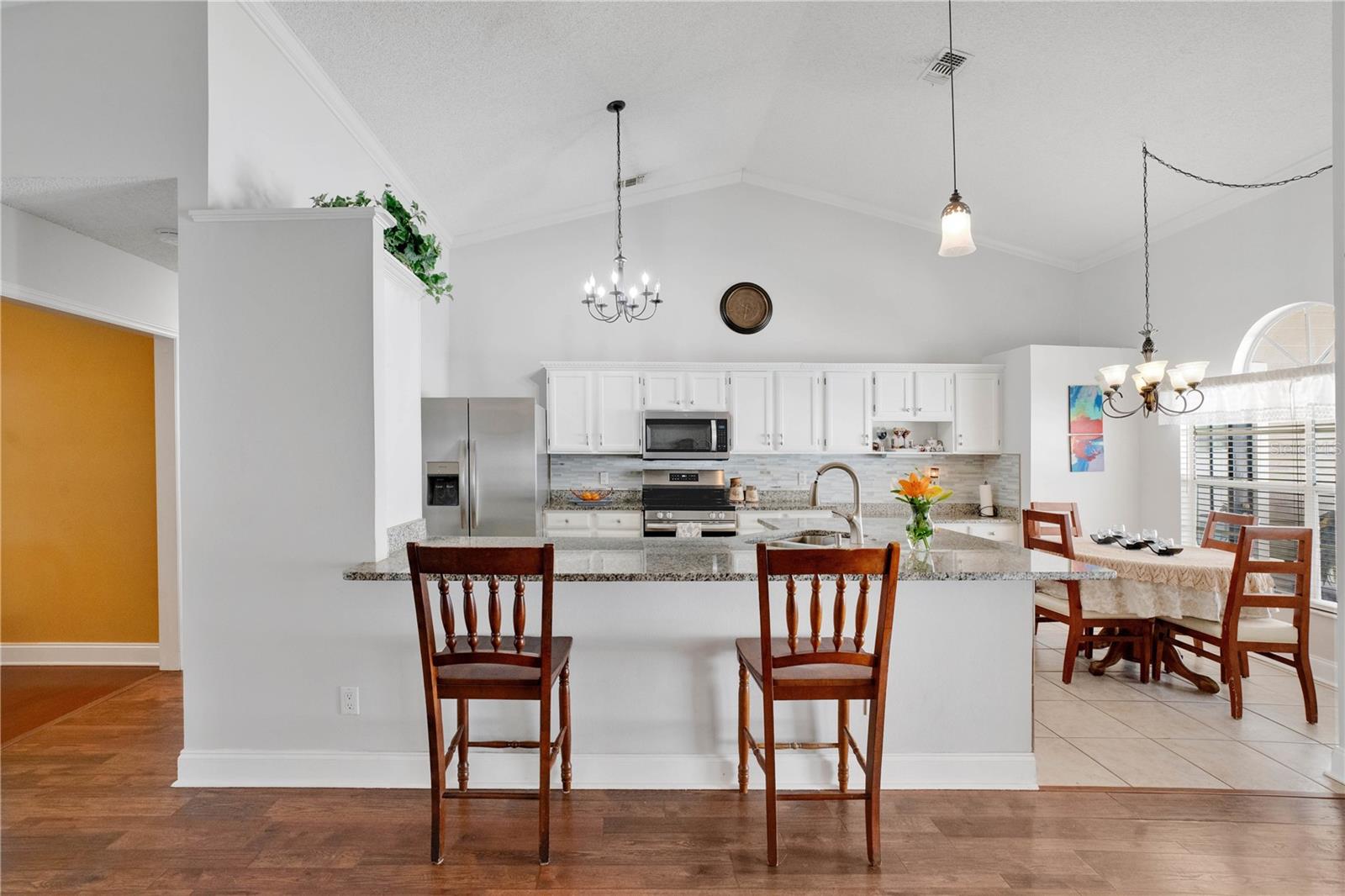 The chef’s kitchen is a true highlight, featuring granite countertops, a stylish backsplash, an oversized island with added cabinetry, and a cozy breakfast nook for casual meals.