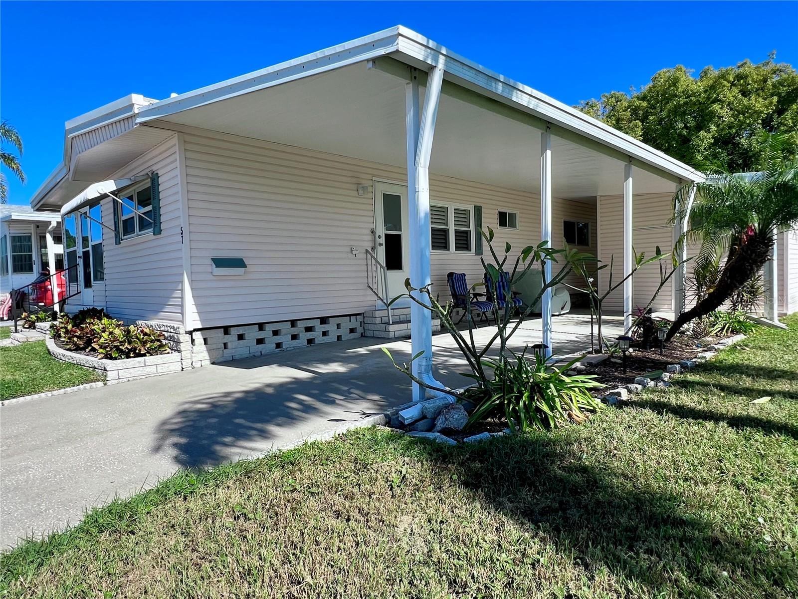 GREAT LOCATION!!!!! This home is situated on a desirable corner lot which offers a partial view of the lake and easy access to the community’s front gated entrance. This fully furnished two-bedroom, two-bath residence features laminate flooring throughout, a predominantly drywall interior, and updated double-pane windows with some indoor Plantation shutters for energy efficiency and comfort. Lovingly maintained over the years, the home boasts significant recent upgrades, including a NEW ROOF installed in May 2023 and a NEW AC unit in 2022. The open-concept kitchen comes fully equipped, while the oversized shed includes a washer and dryer, providing plenty of storage and functionality. The exterior is adorned with durable vinyl siding, and the spacious carport accommodates up to two+ vehicles. This home is move-in ready and ideal for anyone looking for quality and value. The community enforces high standards of appearance and pride of ownership. Recent upgrades include a newly built clubhouse, opened in 2022, offering a range of social activities such as golf, shuffleboard, billiards, and over 50 other events. The HOA Co-op fee is $420 per month and includes water, sewer, garbage, lawn maintenance, spectrum internet, and basic fiber optics cable. Fairway Village is a gated community with newly installed gates, providing an added layer of security. Don’t miss your chance to own this exceptional affordable home in Fairway Village. —schedule your showing today!