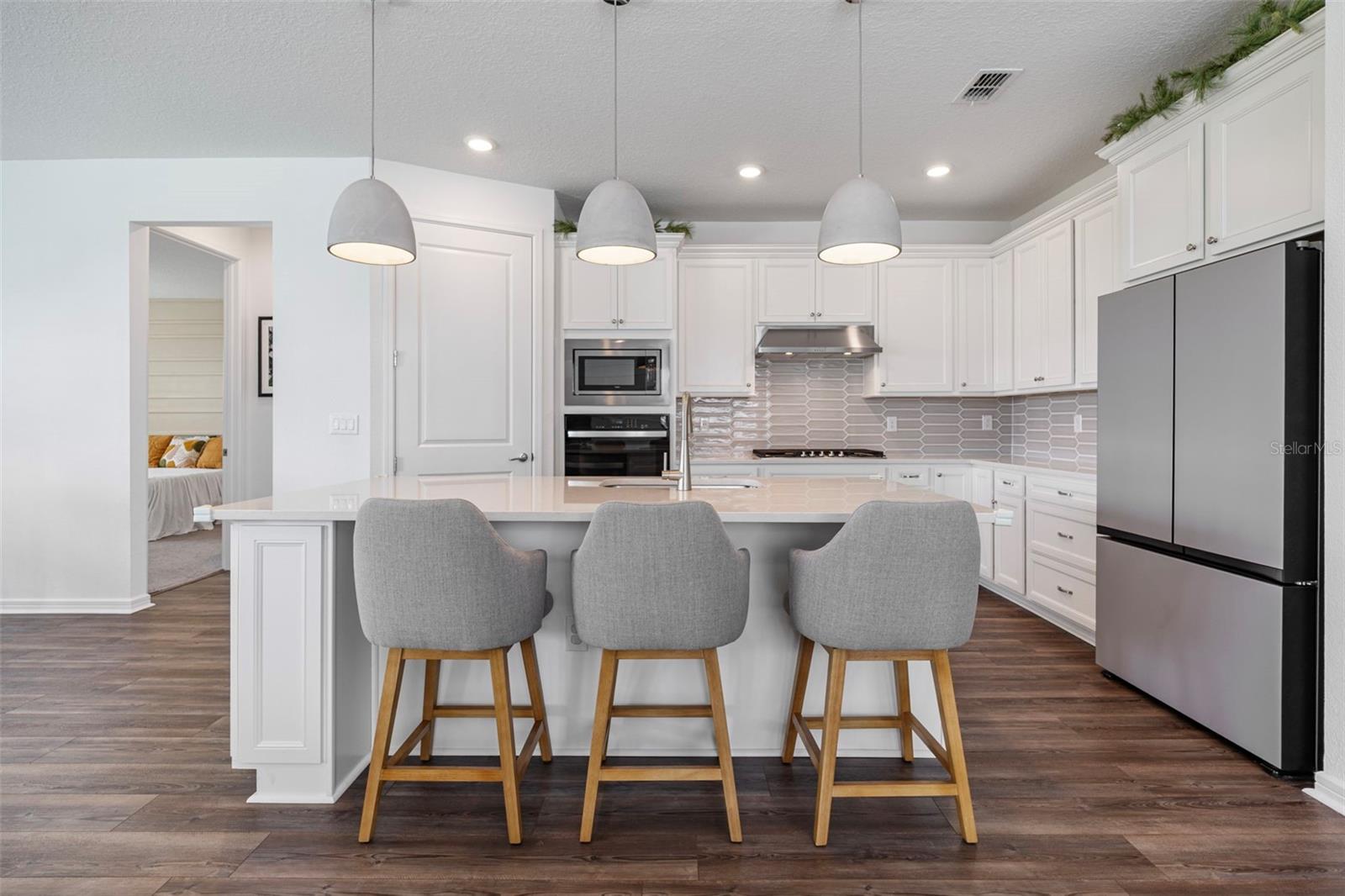 The designer kitchen is a true showstopper, featuring stainless steel appliances, a modern backsplash, quartz countertops, tall wood cabinetry, a built-in oven and microwave, cooktop with range hood, and a large center island with bar seating—ideal for casual meals or hosting guests.