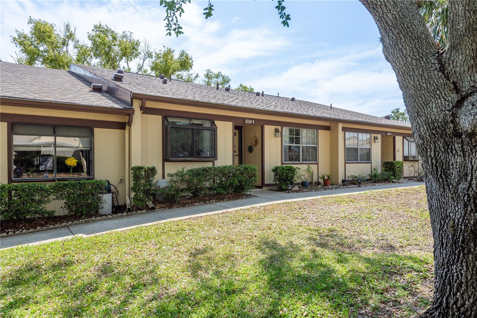 On the market, first time in 20 years! Step into this gorgeous 2-bedroom, 2-bath condo, situated overlooking green space area in the scenic Dollar Lake Village within the highly desirable Timber Oaks 55+ community. This lot is located on one of the highest points in community. No flooding or damage during last hurricane season or seller says in the entire 20 years she has owned it. New Roof within last 2 years. This move-in-ready unit blends comfort with style, offering a bright and welcoming atmosphere. A stylish glass storm/screen door invites you inside, leading to a modern kitchen equipped with white appliances, a reverse osmosis system, a closet pantry, and open to dining and great room. The spacious dining and living areas are bathed in natural light from a solar tube, there’s also a flexible space perfect for a dry bar, coffee station, or additional storage.