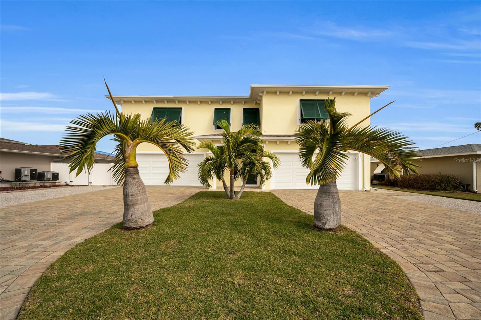 Built-to-last above base flood elevation with all block construction and poured concrete floors, you’ll appreciate the peace of mind offered by this exceptional waterfront residence. A spacious brick paver driveway, generous 6-car garage parking, and two 10,000 lb boat lifts make this the perfect place for your vehicles and watercraft. Driftwood-style porcelain floors, lovely crown woodworking and tall 10ft-high ceilings introduce a wonderful open floorplan with beautiful views of the waterfront. Your spacious living room opens to an elegant 225sqft covered balcony with a built-in electronic sunshade. Fabulous chef’s kitchen boasts fine quartz counters/backsplash, rich coastal cabinetry, huge wrap-around multi-level breakfast bar, under and above cabinet lighting, and pantry closet. Double doors open to a fabulous waterfront owner’s suite that opens to the waterfront balcony and features two walk-in closets with built-in dressers. Owner’s bath provides dual quartz vanities and an exquisite designer walk-in shower with seating bench. Second bedroom is oversized and en suite, and has a graceful bath with jetted tub and shower. Third bedroom is spacious and has a walk-in closet with adjacent full guest bath. Out back discover a huge 470sqft covered deck that transitions to a large paver area with a gorgeous Pebbletech Pool/Spa. Deck offers lots of lounging space and covered outdoor dining. Updated seawall supports a composite dock with two boat lifts. Bahamian shutters on the outside, plantation shutters on the inside, large and well-finished laundry room with extensive cabinetry storage, lower-level multi-purpose area, large 8ft-high elevator, PVC privacy fencing, and so much more. Located within easy walking distance of the beach, dining and entertainment. An outstanding value in an excellent waterfront boating community! Buyer to verify all dimensions. Bathroom Mirror does not Convey.