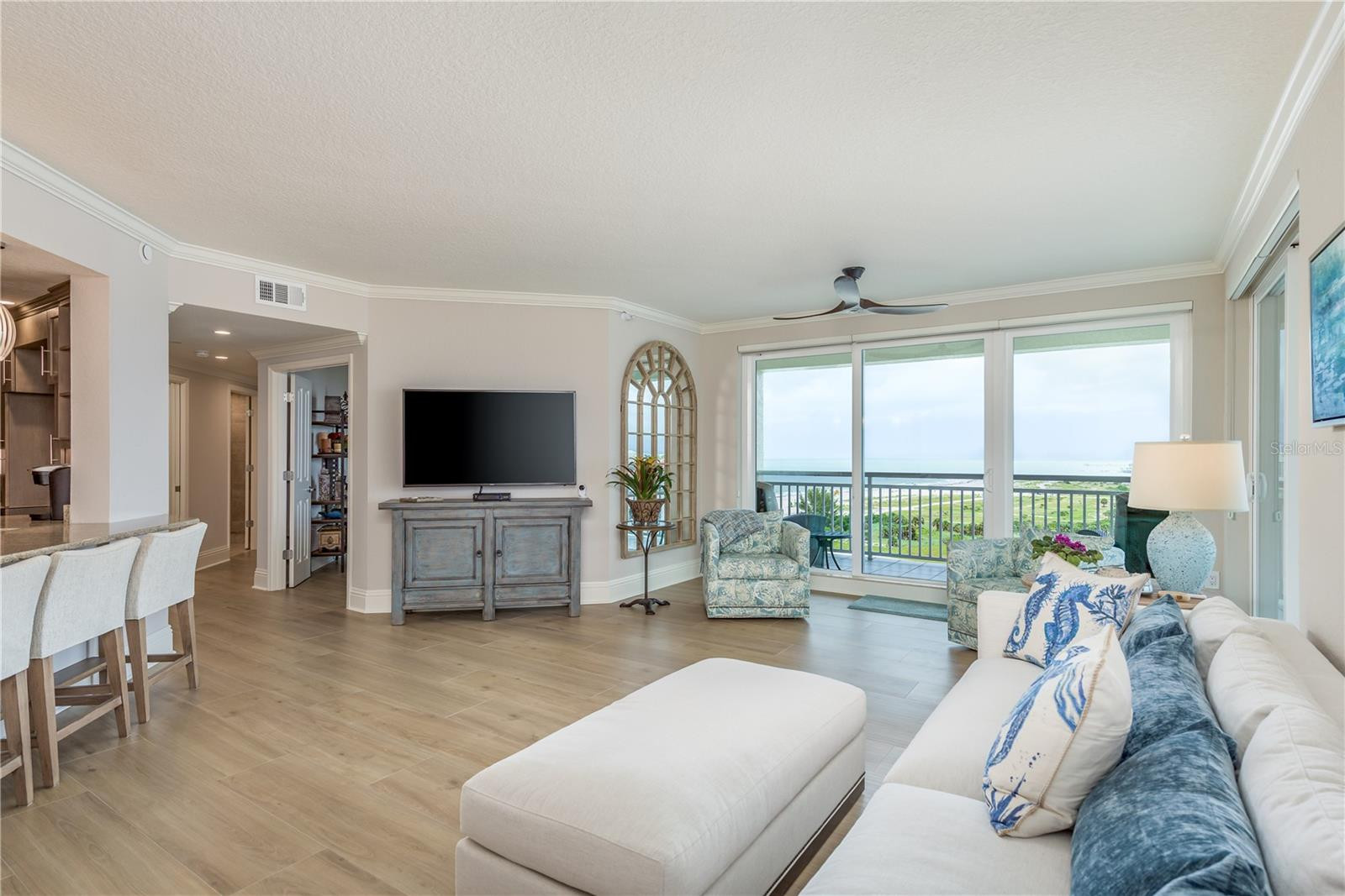 The interior has been freshly updated with custom wood cabinetry, soft lighting, extra-large baseboards, and new flooring throughout. The chef’s dream kitchen features quartz countertops, upgraded appliances, a wine fridge, and ample storage space. The spacious primary suite includes a walk-in closet, linen closet, and a luxurious en-suite bath with double vanities, a large glass shower, and more custom cabinetry. The generously sized second bedroom also includes a walk-in closet, while the third bedroom offers flexibility, easily transitioning into a den or home office. Major upgrades include hurricane-rated sliders (2018), HVAC (2020), water heater (2021), and a brand-new electrical panel (2025).