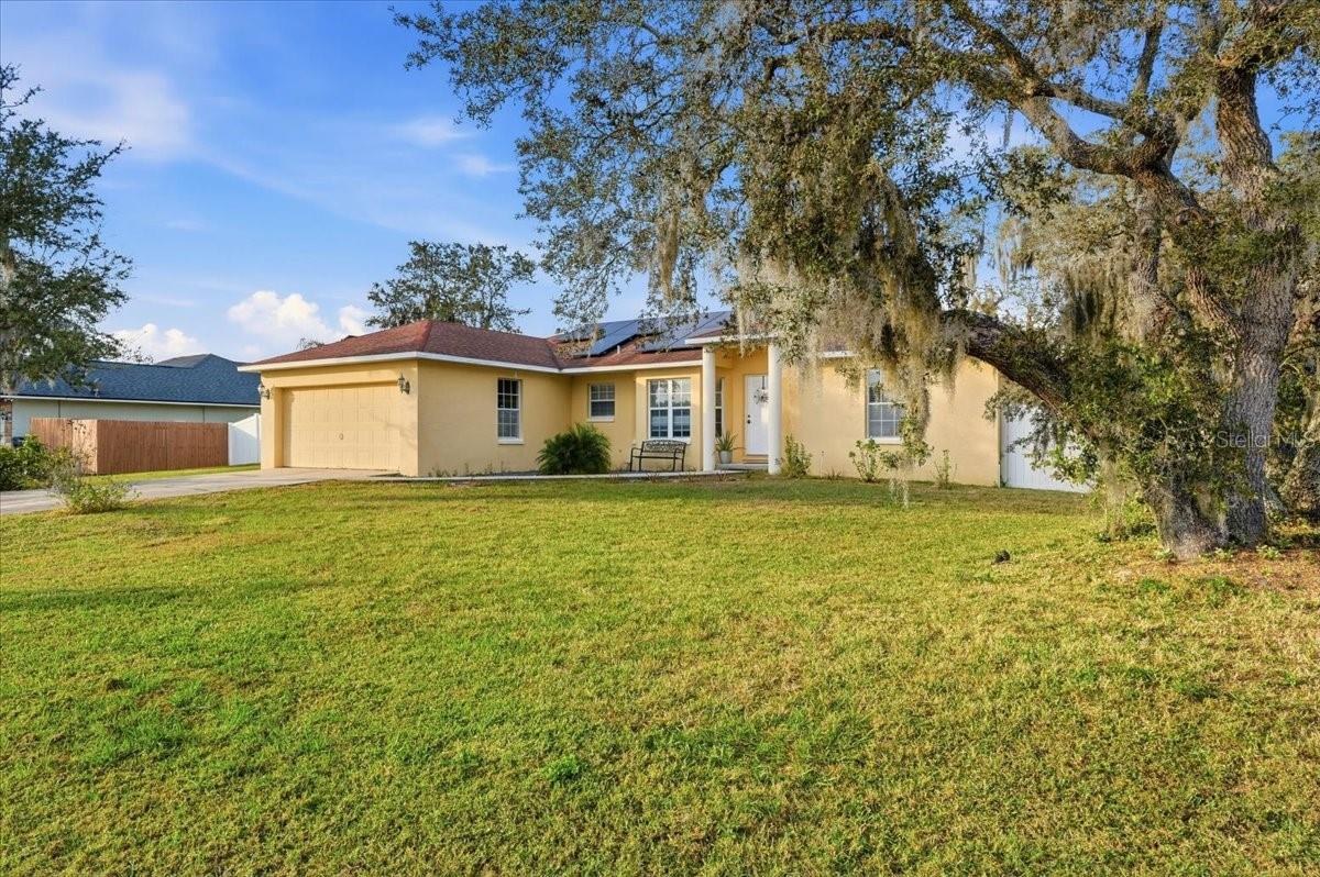 Welcome to this beautifully maintained 3-bed, 2-bath home on a spacious fenced corner lot. Pride of ownership shows throughout with a split floor plan, tile flooring in the main areas, and a bright dining space overlooking the landscaped front yard. The primary suite features a walk-in closet, upgraded tile, jacuzzi tub, and separate shower. French doors lead from the living room to a private backyard with upgraded vinyl fencing and dual gate access perfect for parking RVs, boats, or trailers. Enjoy a screened porch, a full laundry room off the kitchen, and a side-entry 2-car garage. The home also has a solar system installed; seller reports low electric bills. Solar will be completely paid off at closing. With NO HOA, this property offers flexibility, space, and everyday comfort in a convenient location close to shopping, dining, and major roadways.