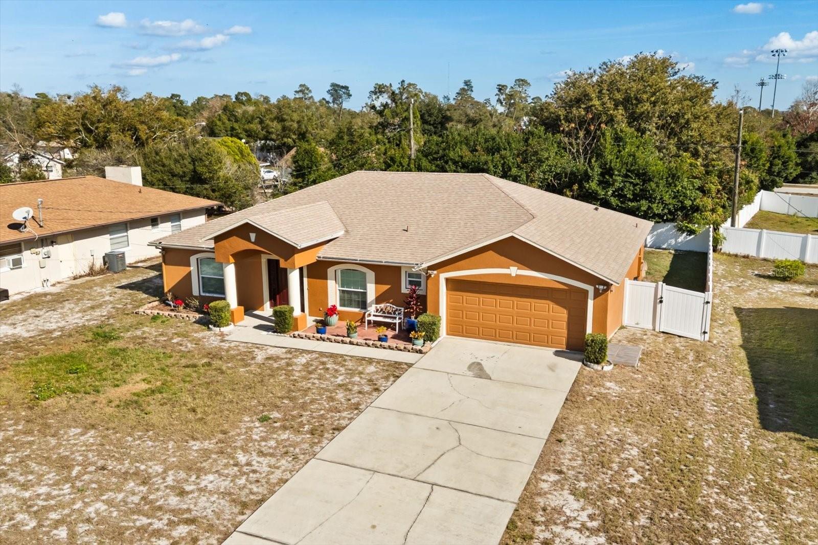 Welcome to this beautifully well-maintained home located in the desirable Deltona Lakes community. Offering over 2,000 square feet of heated living space, this residence features an open and split floor plan designed for both comfort and functionality, including a spacious home office ideal for remote work or a flex space. Tile flooring flows throughout the entire home, complementing the expansive kitchen with an oversized island that opens seamlessly to the large great room with soaring ceilings—perfect for everyday living and entertaining. The primary bedroom is a true retreat with an ensuite, complete with a soaking tub, walk-in shower, and generous walk-in closet. Two additional bedrooms are thoughtfully positioned on the opposite side of the home, providing privacy for family or guests. Recent upgrades include a new A/C unit, a roof replaced in 2022, hurricane-impact windows, and French doors leading to a large backyard with plenty of space for outdoor enjoyment. Hurricane shutters are included and conveniently stored in the garage. This move-in-ready home combines peace of mind with comfort and space. Schedule your private showing today! Close to I-4 for easy access to Orlando or Daytona Beach.