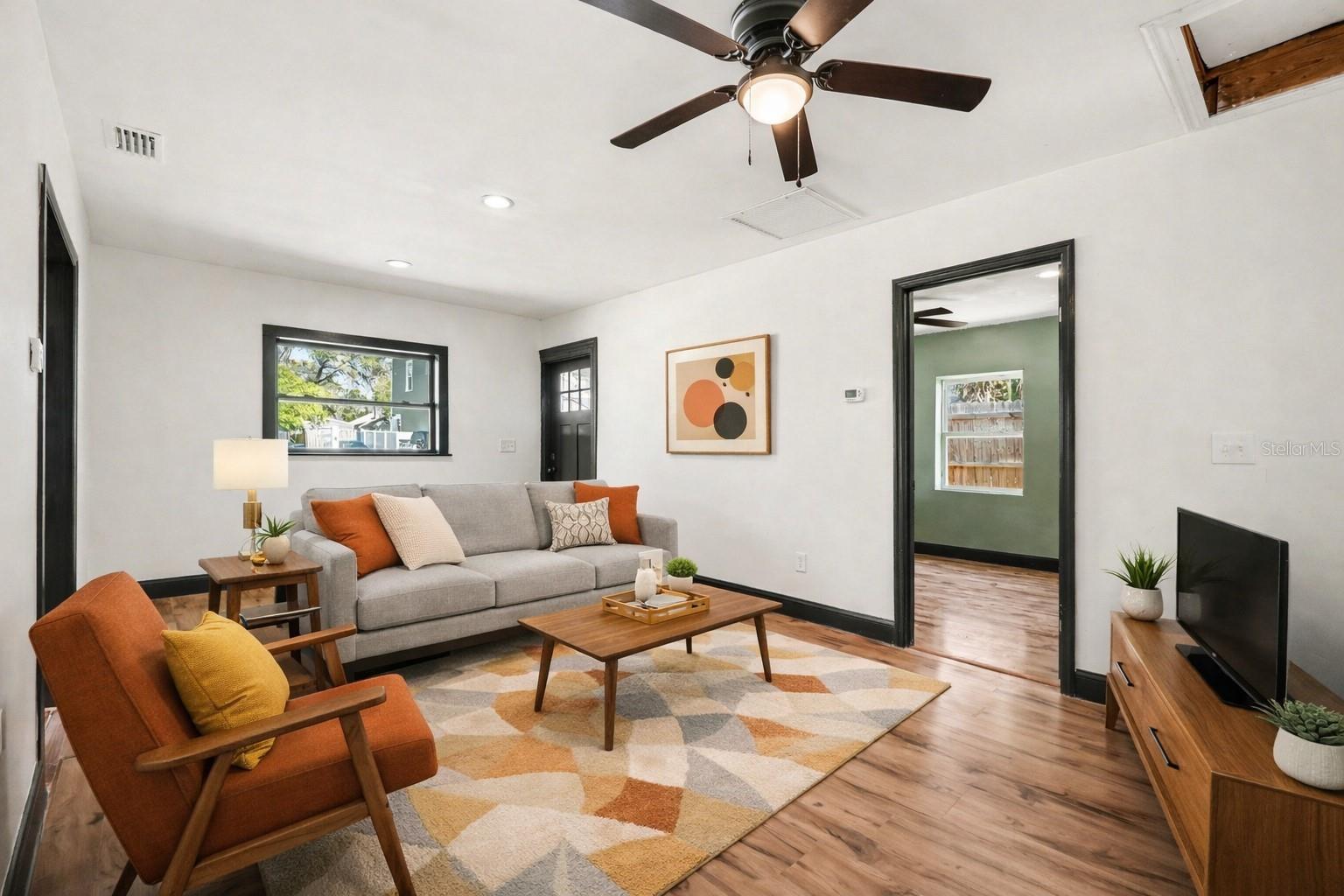 One or more photo(s) has been virtually staged. Short Sale. Short Sale. Renovated and move-in ready, this 3-bed, 2-bath home in Seminole Heights blends sleek modern conveniences with classic style. The kitchen stands out with dark cabinetry, bright quartz counters, vibrant tile backsplash, and a slide-in range with a chef's hood under a wood-plank ceiling. A painted stone accent wall and warm trim add depth and character throughout. The open floor plan offers flexible living and dining options with easy flow. The primary suite sits privately at the rear, featuring a walk-through closet to the ensuite bath and laundry area. Fully fenced with rear-alley access to a paved drive which is ideal for parking or small boat/camper storage. Surrounded by new construction, this property delivers style, function, and outstanding value in the heart of this historic district.