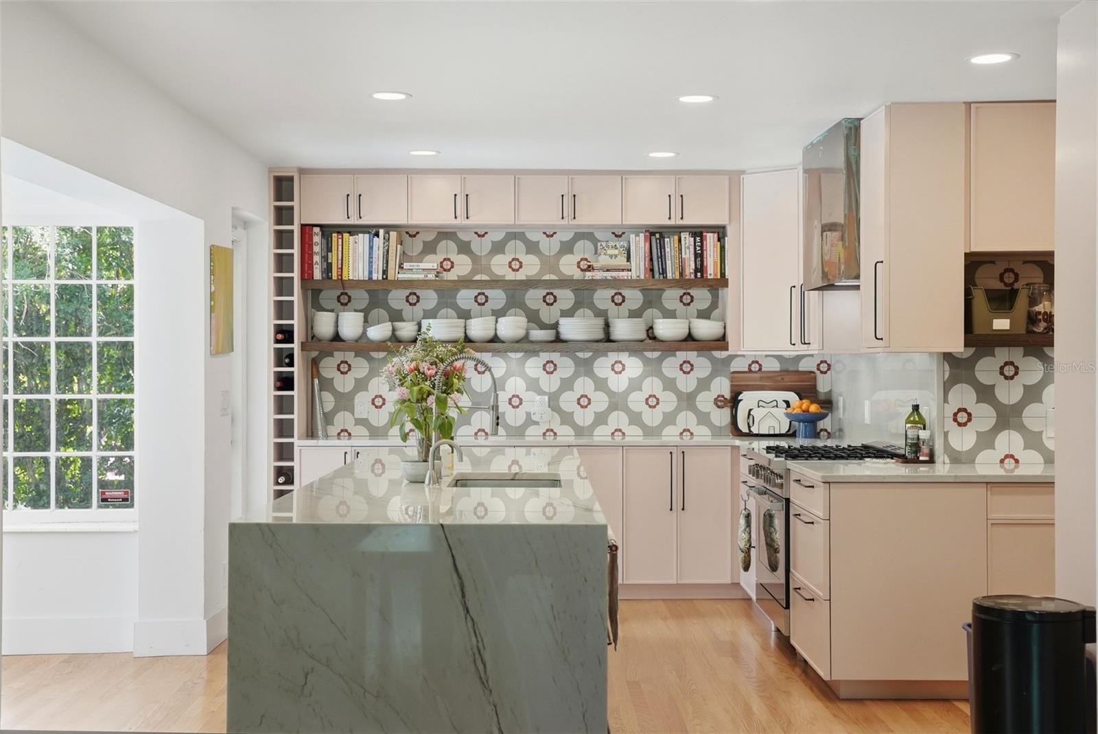 The newly renovated chef’s kitchen is a true showpiece, featuring a statement copper hood, gas range, blush-toned cabinetry with abundant storage. Adjacent, the eat-in breakfast nook—encased in elegant window-paned glass—offers tranquil views of the private, fenced backyard, the perfect spot to enjoy your morning coffee or a relaxed home cooked meal.