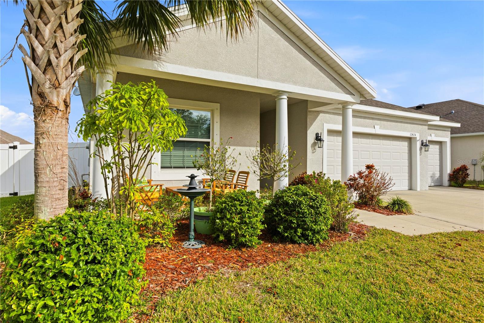 Welcome home to your beautiful 3-bedroom, 2-bath home featuring porcelain tile throughout with carpeted bedrooms, granite countertops, and Maytag appliances. The eat-in kitchen and separate dining room open to high ceilings, creating a bright, open feel. This split-style layout places all bedrooms on the same side of the home while still offering privacy, with bedrooms 2 and 3 and the second bath positioned away from the spacious owner’s suite, which is large enough for a king-size bed and additional furniture and includes a private bath and walk-in closet. Enjoy a welcoming front porch, a screened lanai in the back, and a large, fully fenced backyard ideal for privacy and pets. Additional features include a 3-car garage with an extended driveway, hurricane shutters, smoke-free interior, and a small, hassle-free community conveniently located near shopping, dining, hospitals, and I-75.