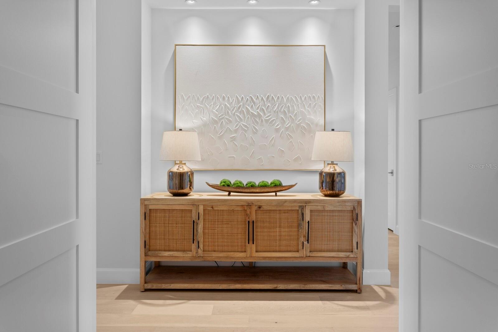 1201 Interior Finishes & Features: Wide-plank light European oak hardwood floors run seamlessly throughout the entire space providing a bright and contemporary foundation. Kitchen: Waterfall-edge countertops in honed white and beige-veined quartz provide an elegant, marble-inspired look with the durability of engineered stone. Thermador appliances, a wine fridge, an induction cooktop, and a deep granite farmhouse sink. Kitchen Cabinets: High-gloss flat-panel cabinetry in a soft buttery cashmere color tone delivers clean lines and ample storage, paired with under-cabinet LED lighting for a polished designer finish.