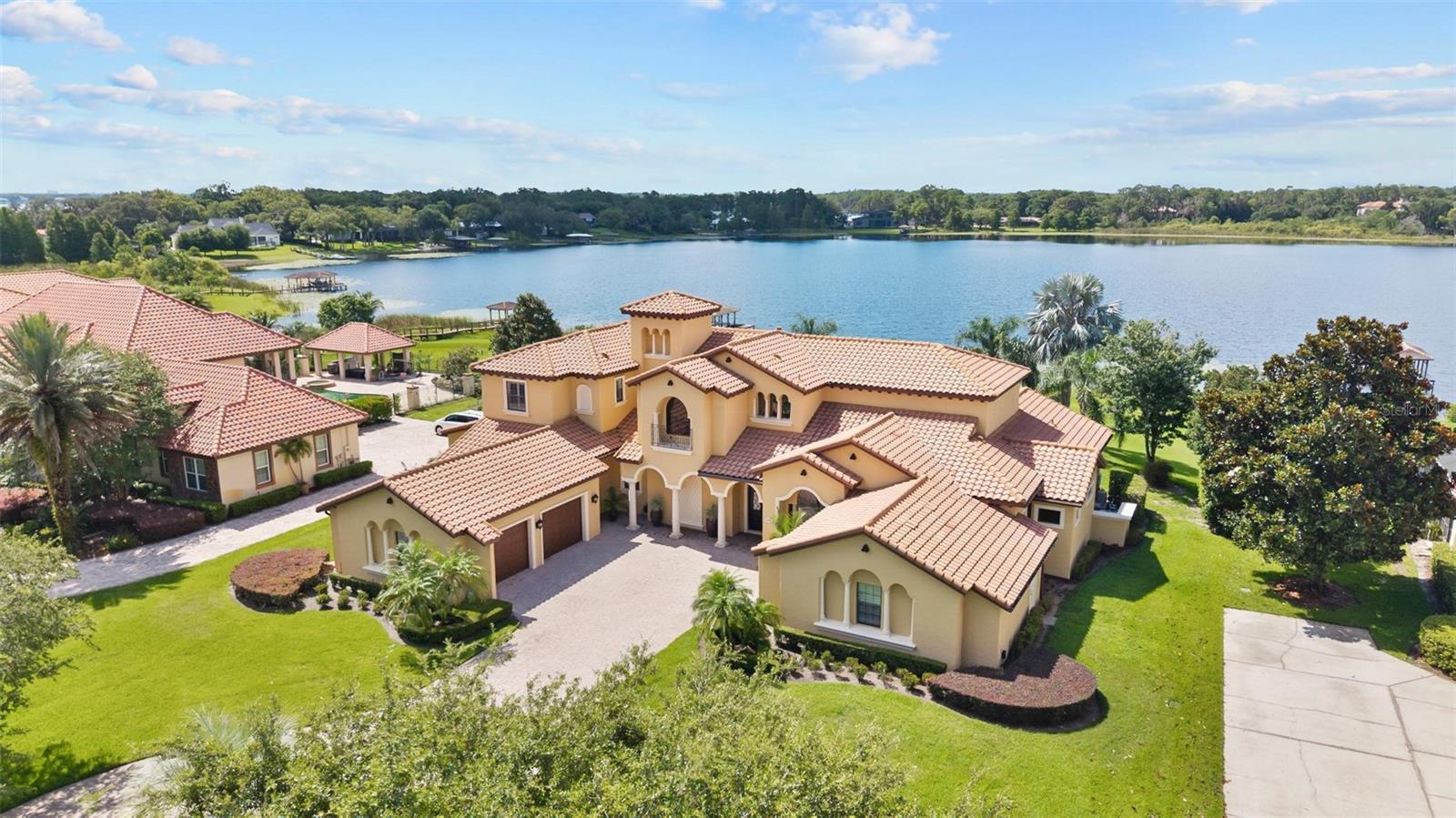 Discover the pinnacle of elegance and tranquility in this exquisite custom-built estate, ideally positioned on an expansive lot within an exclusive guard-gated community. With direct access to a crystal-clear spring-fed lake that permits private boat docks, this home offers a rare blend of relaxation, recreation, and refined living.
