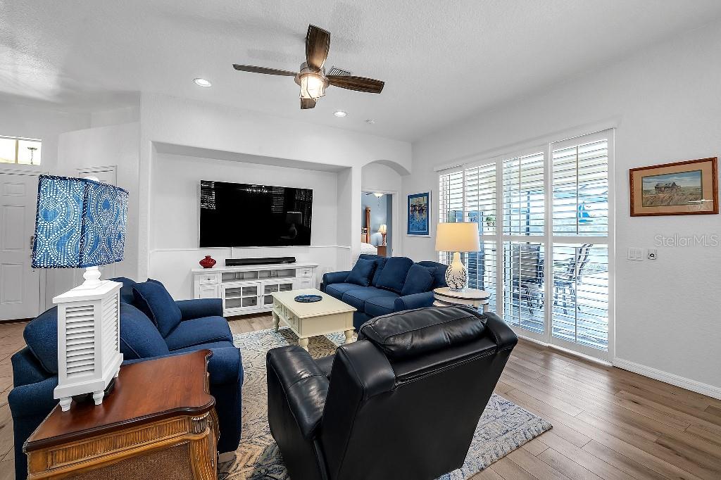 Welcome to a beautifully maintained 3-bedroom, 2-bathroom home nestled in the highly sought-after, maintenance-free gated community of the Venetian Golf & River Club. This stunning home offers the perfect blend of comfort, convenience, and an active lifestyle, all in an unbeatable location. Step inside and be greeted by an inviting, open-concept floor plan designed to maximize natural light and functionality. The spacious living area flows seamlessly into the newly renovated kitchen and dining spaces, creating a perfect layout for both everyday living and entertaining. This home also offers plantation shutters throughout, newer A/C, remote storm curtain, laminate and tile flooring, gutters and freshly landscaped. One of the standout features of this home is the extended lanai with panoramic views of the lake and preserve. The screened in enclosure