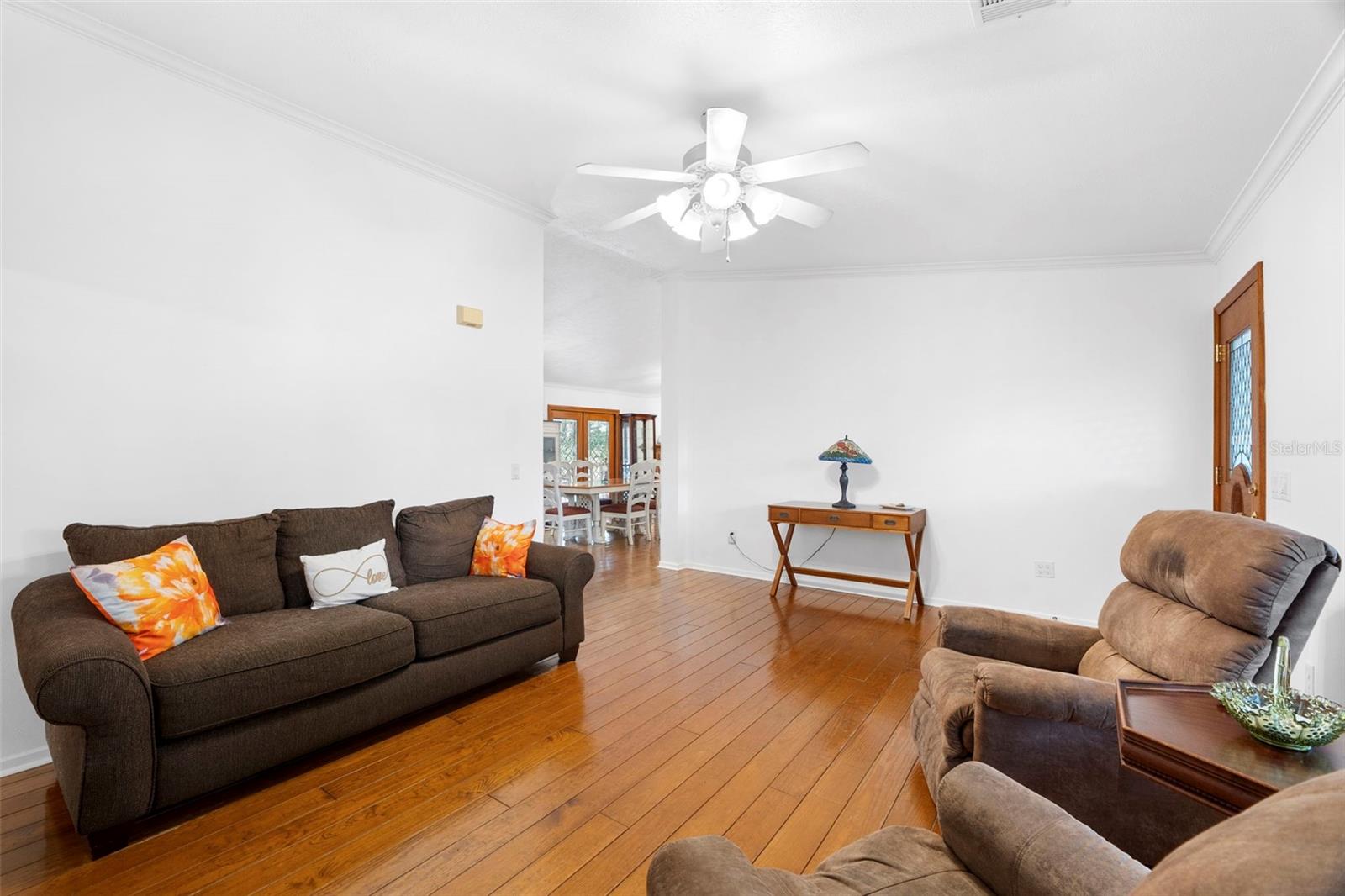 Welcome to your Florida oasis! This charming 4-bedroom, 2-bathroom home located on a quiet street in Odessa. Sitting on 0.57 acres, this is ideal for horse enthusiasts. Enjoy the low maintenance, mature landscaping, which includes a variety of fruit trees, oak trees, flowers and other native plants. This property combines comfort with a touch of nature. Entering the home, you will be welcomed with an open floor plan, crown molding, gorgeous knotty pine wood flooring throughout, and a spacious living and dining room. This home offers an abundance of natural light! The open concept kitchen is fully equipped and features solid wood cabinets, a walk-in pantry closet, and plenty of storage. The sizeable primary bedroom features a walk-in closet, and an en-suite primary bathroom with dual vanity sinks, a garden bath, and a walk-in shower. The other 3 rooms have plenty of storage and features a shared bathroom with a shower/bathtub combination. Large front and back covered porches which are perfect for entertaining. This home is on a concrete slab. Detached 2 car garage. Multiple sheds. Centrally located and close to shopping centers, restaurants, schools, and so much more! Metal Roof. 2017 HVAC. 2022 Water Heater. Freshly painted interior. Plenty of room to park all toys, RVs, and boats. Plenty of room to build a guest house or dream pool or pasture. NO HOA. NO FLOOD ZONE. ZONED FOR HORSES!
