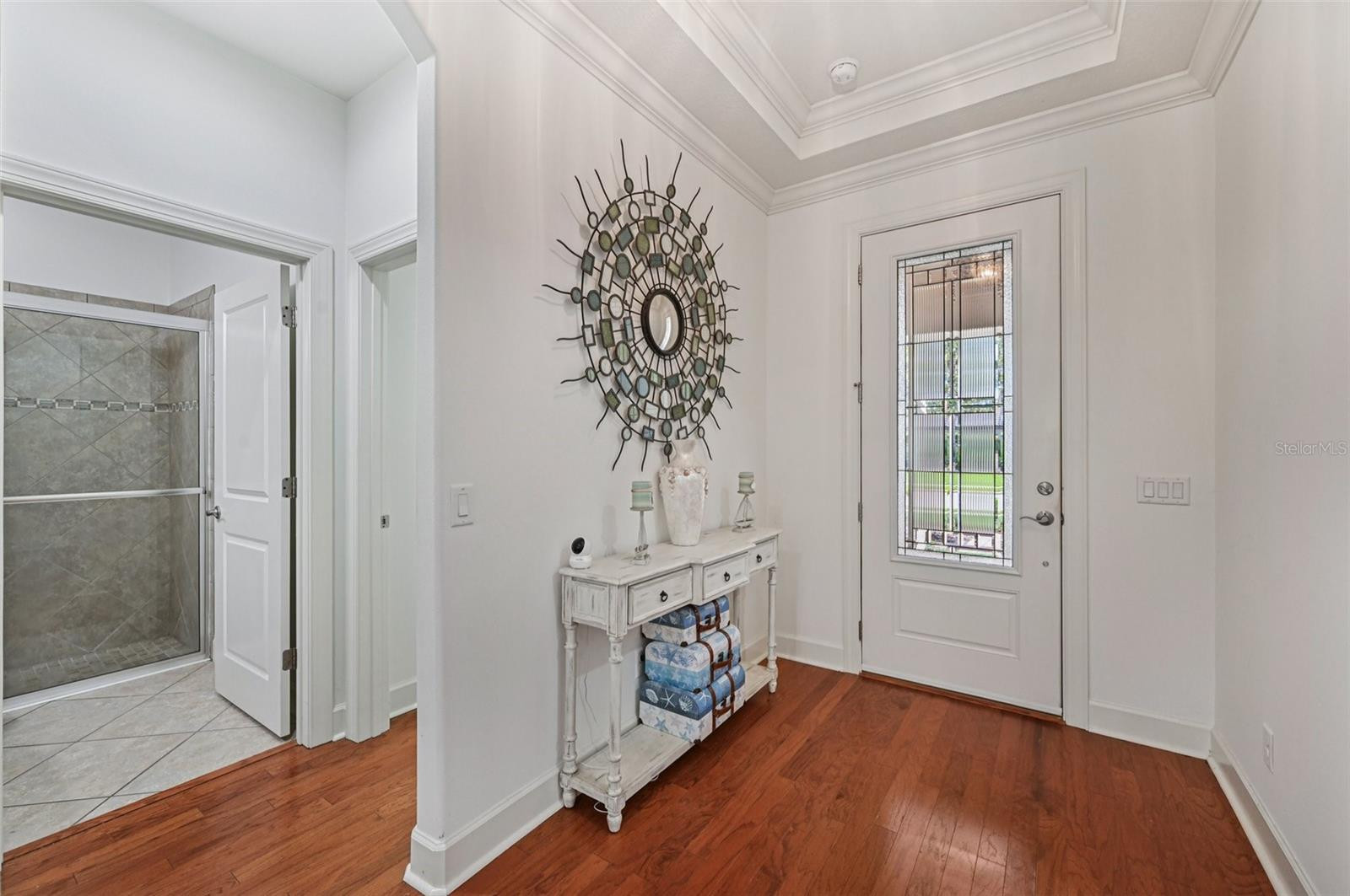Come live the resort lifestyle in the highly desired Esplanade community. A sanctuary inside and out, this home welcomes you with a light filled open concept Lazio model design with engineered hardwood floors, designer light fixtures, tray ceilings and opulent crown molding throughout. The chef's kitchen boasts Monogram appliances, double ovens, pantry, touchless faucet, granite counters with a huge island for entertaining. The open living and dining areas are great to accommodate all your guests inside or you can open all the sliders to the screened extra large lanai. This 25 x 36 peaceful area is gorgeously landscaped and you can enjoy the serene waterfall of the koi pond and lush greenery. There is plenty of space for seating and access to the granite wet bar and full outdoor kitchen with stainless cabinets, grill, sink and refrigerator. The owner's suite is equipped with a large closet with custom built ins, an expanded size shower with seat, and double sinks over granite marble counter. Two other full baths with granite counters and fine finishes are adjacent to the two other nicely sized bedrooms. Additionally there is also a 11x13 bonus room/office/den behind frosted glass doors offering great flexibility. A full laundry room with plenty of cabinets and counter space is right off the 2 car garage. At the end of the street you have tennis courts, pickleball, waterfront park and large pool; with 2 additional pools, fitness center, golf club, spa, nail salon, dog parks, and restaurants just a short walk away in the community. There is no need to pay more for a deeded golf membership when all residents can use the amenities for just a fee. Explore all the benefits at the community website, esplanadelwr. Whether you are going to out of the town to the Waterside district, Sarasota's wealth of cultural highlights, or a lazy day at the nearby beaches of Anna Maria or Siesta Key, there is something here for everyone.
