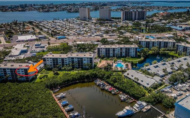 RARE 5th-floor CORNER UNIT with stunning water views in every direction — the kind of opportunity that doesn’t come along often in the highly sought-after gated community of Pasadena Cove. With wide panoramas of the marina, Boca Ciega Bay, and even Gulf of Mexico glimpses from the front walkway, this spacious 2-bedroom, 2-bath layout offers unmatched natural light and endless potential.