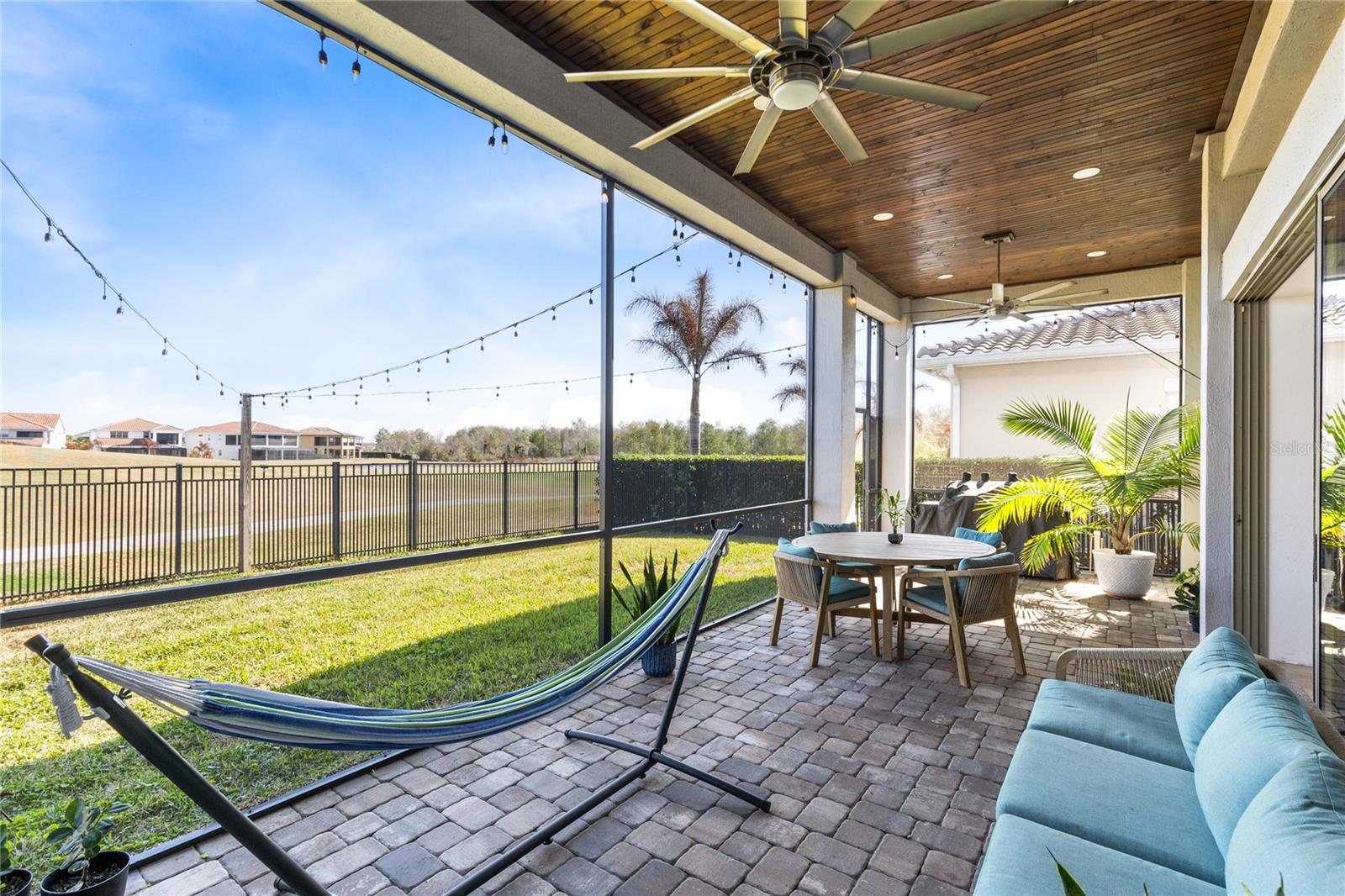 Step outside to the screened lanai and take in sweeping golf and distant water views. The fully fenced yard offers space for pets and room to design your dream pool.