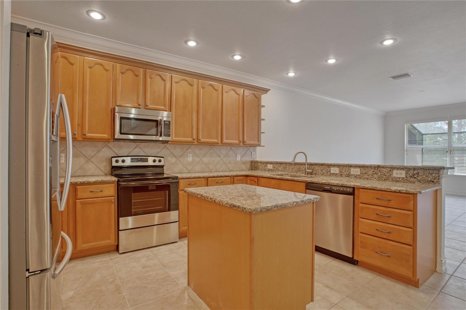 The kitchen has stainless steel appliances, granite countertops and maple cabinets, center island and a raised serving bar. The French doors will take you to the private and spacious screened Lanai. You could relax here or head to the well maintained community pool, just a few steps away.