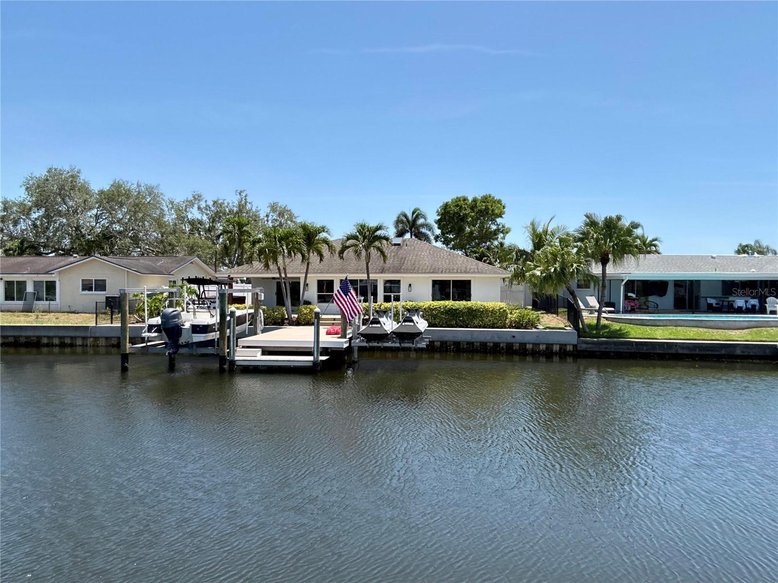 Join the Ponderosa Shores renaissance. This home is an open canvas to renovate as you please, or join your next-door neighbors and raze the home and build your waterfront dream home on this spectacular waterfront lot that has a newer 81’ seawall with 3’ cap, 300 sf custom dock with two boat lifts, and room for a pool. This home is just a short drive to vibrant downtown St. Pete, a 10-minute idle to Tampa Bay and only a few paddle strokes to protected Placido Bayou Mangrove Preserve where you can explore the mangrove trails by kayak or paddle board. Watch dolphins and manatees swim around and under your dock while you enjoy the sun set behind the mangrove preserve. The newer 40th Avenue bridge has a 13.2’ vertical clearance at mean hightide to accommodate most non-flybridge vessels. This beautiful waterfront home flooded during Hurricane Helene and was fully remediated with 4’ drywall cuts throughout the entire home. All flooring with the exception of the two bathrooms was removed and is currently bare concrete slab floors. Until Hurricane Helene in September, 2024 this home had never flooded since its construction in 1972. Protected waterfront with superior all-block construction; 3 bedrooms, 2 bathrooms with open concept, split floor plan;1,789 heated sq/ft, 2,535 total square feet; 2-car garage with hurricane impact garage door and Smart Home garage door opener, paddle board and fishing rod storage; Lot size: 7,797 sq/ft (0.17 acres MOL. 81’ wide x 102’ deep MOL); Smart Home features Vivint security/fire alarm system; 81' newer seawall with 3’ cap (Gulf Coast Marine Construction); Two Lifts: 10,000 lb boat lift and 4,500 lb double jet ski/boat lift; Large Custom Dock: 300 sq/ft (25’ x 12’ w/ 3’ step down platform for easy launching of kayaks and paddleboards) with superior Azek composite cool decking with wrap around trim, high density polyethylene wrapped dock pilings, electric and water; Expansive outdoor deck: 660 sq/ft; 8-person hot tub (hot tub damaged by flooding); Roof: 2012 – GAF Timberline 30-year upgraded shingle with roof membrane (assumable warranty) and updated soffits and facia (no damage experienced from hurricanes); Newer HVAC 2021: Trane, 16 Seer (4 ton) Heat Pump with UV Light system for improved air quality. Warranty: 10-year warranty for Compressor (Compressor damaged by flooding); 10 years coil; 10 years parts; 22kw Whole House Generac Generator (2022) with transferable warranty (Negotiable with sale of home); Designer lighting throughout; Windows: updated (sliding doors and some windows damaged by flooding); Ceiling fans throughout; Covered Lanai and entrance way improved with hand-stained wood slats on ceiling; Exterior painted: 2022; New Samsung washer and dryer, front loading – 2024 (Never used. Washer might be damaged by flooding); Water main line replaced (2006); Additional and plentiful attic storage with high pitched roof; Expanded paver driveway with 3-car parking; Irrigation system (reclaimed water) and upgraded gutter/drainage system; Windster stainless steel vent hood in kitchen; Skylight (upgraded tempered glass); LED recessed ceiling lighting; Neighborhood has all underground utilities including cable, natural gas and electric (no unsightly power poles and power lines); Primary Bedroom and Ensuite Bath: Overlooking water and adjacent to back lanai; Walk-in closet; Separate water closet; Dual shower heads plus rain shower head; and Dual Vanity Plumbing; Guest bath: Dual Vanity Plumbing