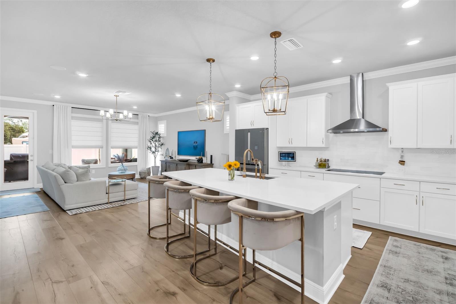Step inside to an open great room dressed in crown molding and wide-plank LVP, framed by custom window casings and motorized shades that disappear with a tap. The kitchen is a chef’s treat: Bosch refrigerator with wine drawer, Wolf induction cooktop paired with a sleek, high-capacity vent hood, and a custom wood pantry that keeps everything organized.