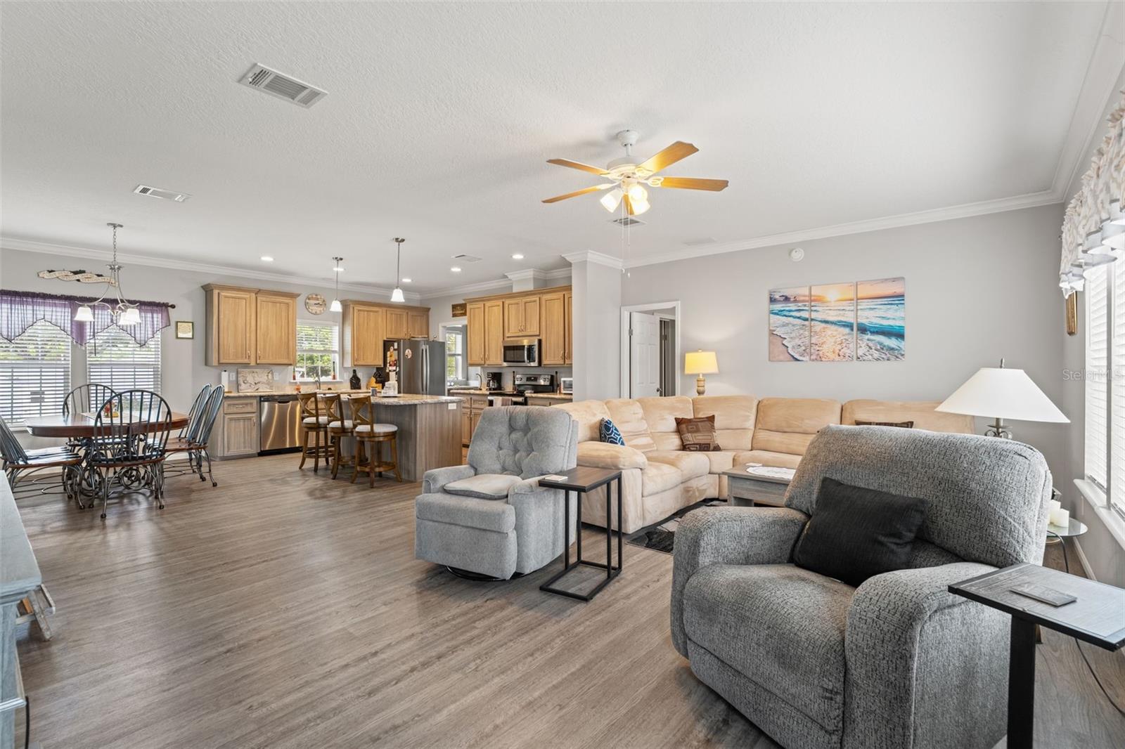 - Interior Features: Ceiling Fans(s), Crown Molding, Eat-in Kitchen, Kitchen/Family Room Combo, Open Floorplan, Split Bedroom