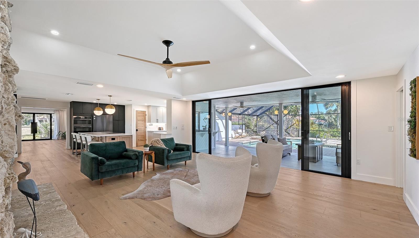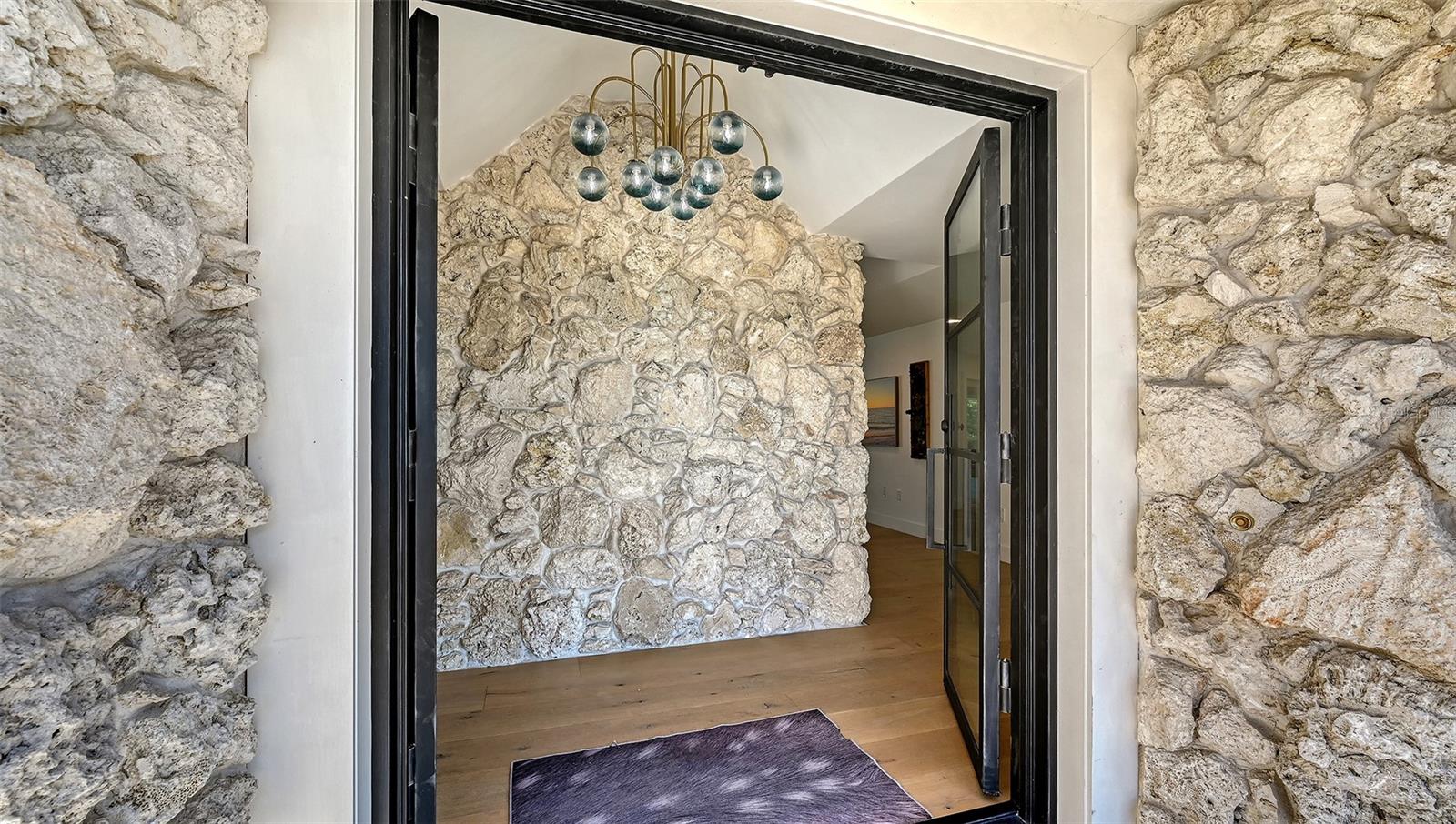 No expense has been spared in the home’s extensive upgrades, evident the moment you step inside. Eight-inch wide white oak flooring, custom cabinetry, and high-level quartz countertops create a refined yet inviting aesthetic throughout. A striking, oversized fireplace crafted from natural coral stone anchors the living space and is beautifully framed by solid iron double doors—an architectural feature unique to this home.