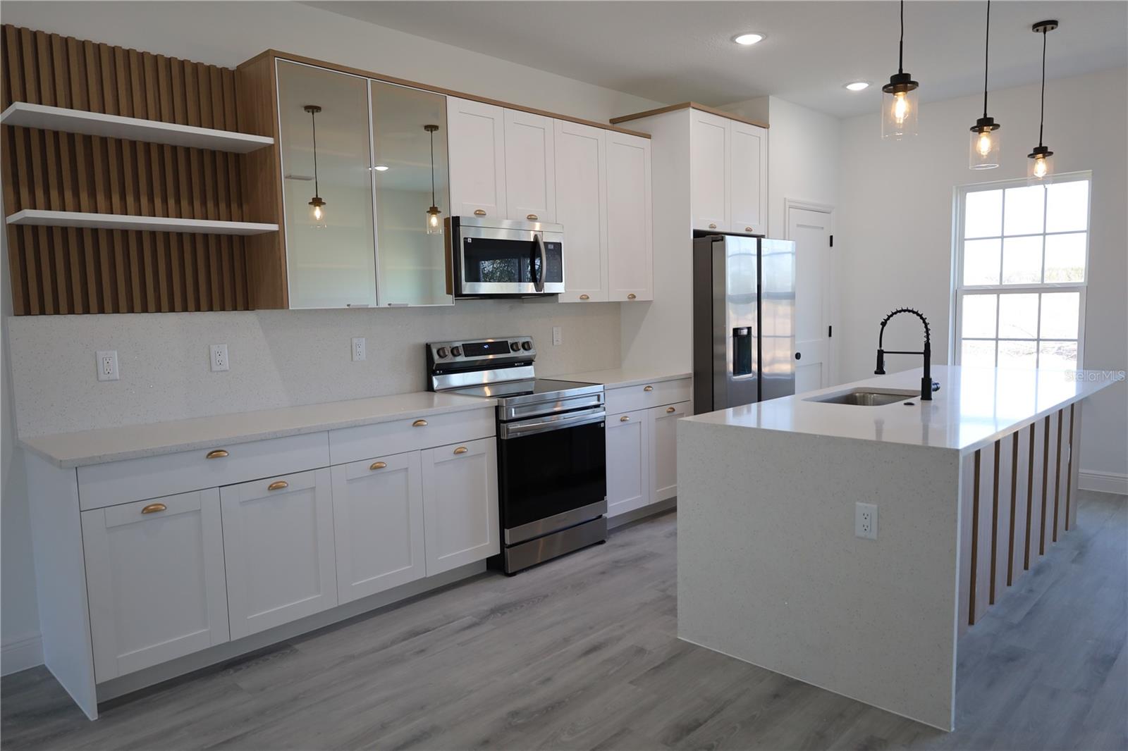 The chef-inspired kitchen is fully equipped with stainless steel appliances, including a range, refrigerator, dishwasher, and microwave. Enjoy the convenience of a large island, abundant shaker-style cabinetry, and elegant quartz countertops with waterfall edges. A stylish backsplash and feature wall add a sophisticated touch to the space.