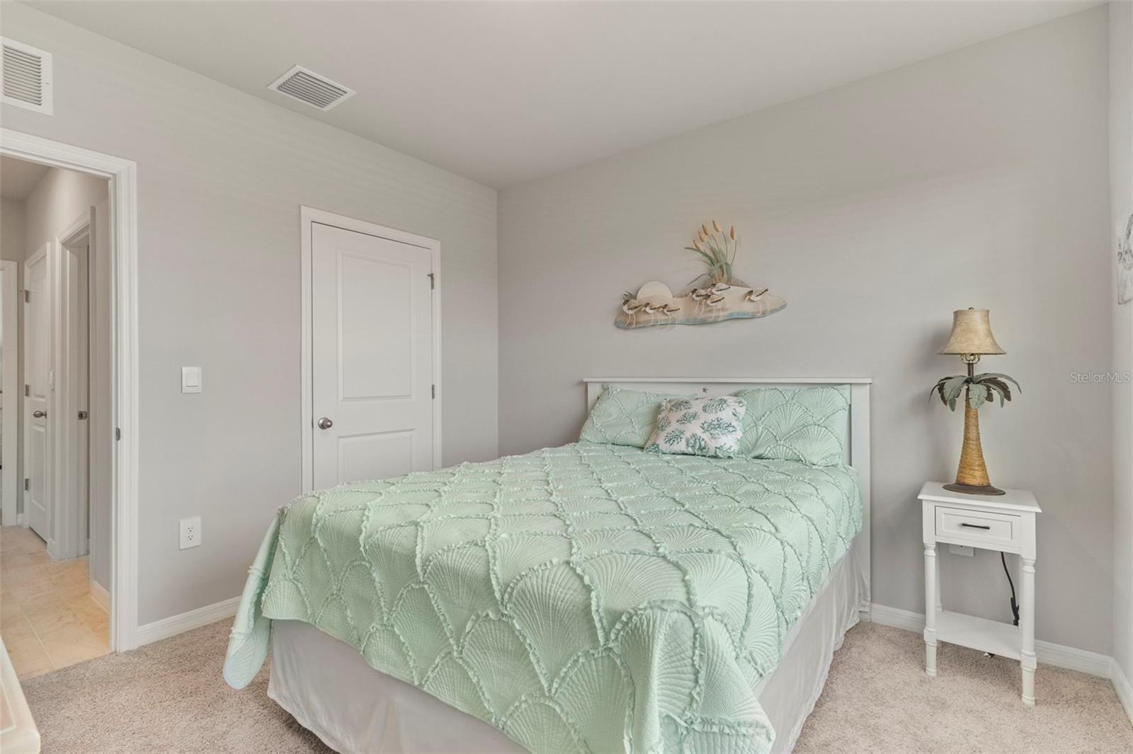 Built in 2025, this single-family home is located in The Cove at Westport, a master-planned community offering resort-style amenities including pools, pickleball courts, walking paths, and beautifully maintained common areas. Situated on a water lot in Flood Zone X, the property provides peaceful views and stunning sunset backdrops. The home was decorated by an interior designer with unique pieces that could become you own.The foyer opens to two guest bedrooms and a full guest bath. The opposite side of the foyer includes a linen closet, laundry room, and a fourth bedroom with a private en-suite bath. The well-designed kitchen features a large island, dining area, and a spacious pantry, and it overlooks the living room and lanai for an open, connected layout. A wall of windows and a sliding glass door bring in abundant natural light.