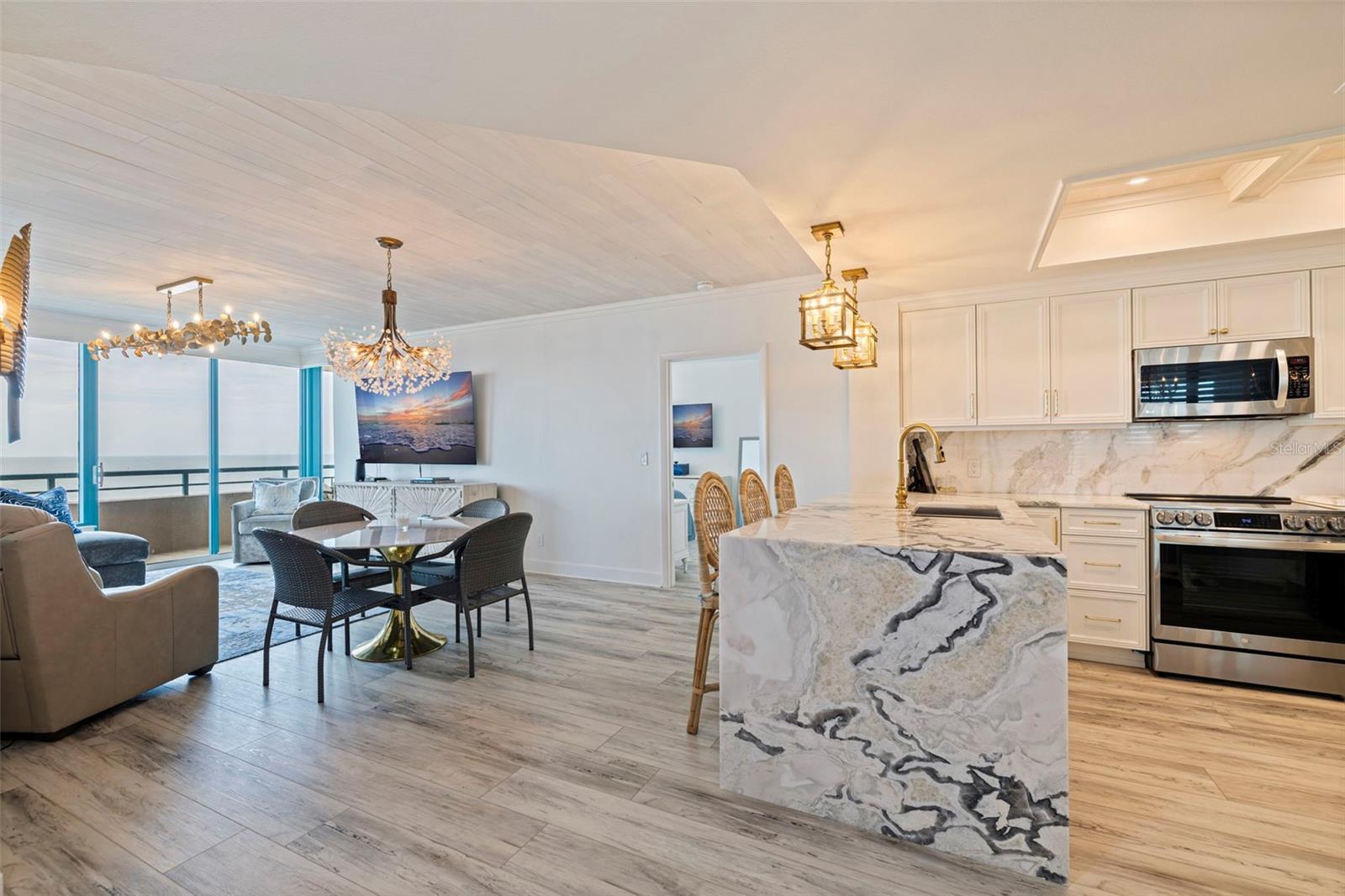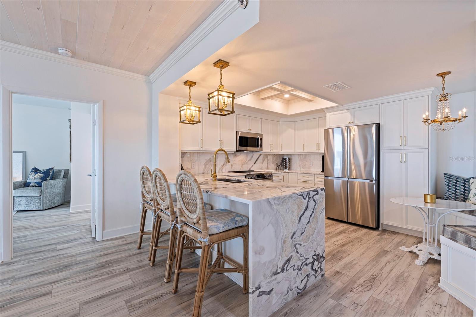 ELEGANCE BY THE SEA! Step into this tastefully updated condo featuring upscale finishes & situated on the sugary sands of Sand Key Beach. Southwest exposture features views way down the beach with stunning sunsets everyday & Intracoastal views! Living Room & Primary Bedroom have sliders that open to a spacious balcony. Luxury Plank flooring throughout for easy maintenance. Living room has wood detail on the ceiling with crown molding. Kitchen featuries wood coffered ceiling. A gourmet's delight with stainless steel appliances, custom kitchen cabinery with Calacatta Namibia Dolomite countertops, slab backsplash & waterfall edge. Eat-in area with banquette seating & storage. Breakfast bar that opens to the living/dining room. Remote Sun Shades at all windows & doors with custom wood valances. Open floorplan with split bedrooms. Wake up in the Primary bedroom to the sounds of crashing waves & beautiful views of the Gulf. Wood wainscotting, large walk-in closet designed by California Closets & ensuite bath. Custom double vanity with dolomite countertops, & lighted vanity mirrors. Separate marble wet area with huge walk-in shower, bench & linen storage. Guest bedroom also features great views of the Gulf & lalrge walk-in closet. Guest bath has designer wallpaper with marble floors & marble walk-in shower. Designer lighting throughout featuring chandeliers by Visual Comfort, John Richard, Palacek and Currey & Company. A/C condensor, air handler & thermostat 2022. Coveted PRIVATE GARAGE #82 in parking garage. The Ultimar is a world class condo complex on Sand Key of famous Clearwater Beach. Miles of pure white sand. Lush tropical landscaped grounds are expertly maintained. 24 hr guard gated. True Resort Style complex has 3 geo thermal heated pools w/spas, 3 tennis courts, pickle ball, basketball ct, putting green, croquet lawn, grill area, firepit area, shuffleboard, corn hole, gym, steam & sauna, billiards rm, media rm, social rm with catering kitchen and baby grand piano. Walk to great restaurants & shops or catch the Beach Trolley right out in front of the building. A short drive to Tampa & the airport plus all of the sports venues of our championship teams. START LIVING THE FLORIDA BEACH LIFESTYLE TODAY!! Buyer to verify room dimensions. See Video. Call to make an appointment for your private viewing today!