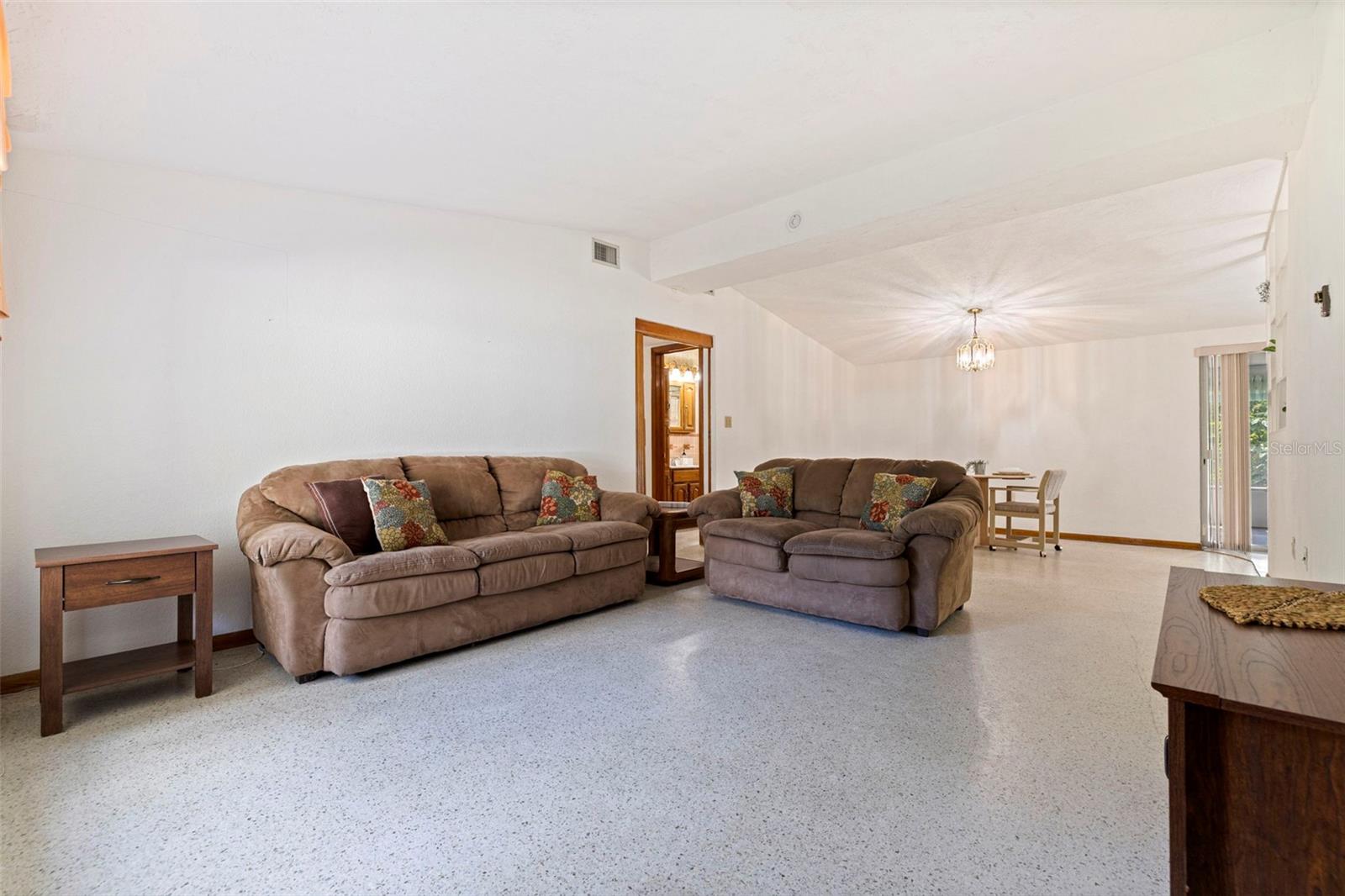 On the opposite side of the home, 3 carpeted Bedrooms are thoughtfully arranged, each with a generous closet for STORAGE + FLEXIBILITY. Throughout most of the home, ORIGINAL TERRAZZO floors are ready to be buffed back to life! An oversized enclosed Florida Room with walls of windows offering a valuable BONUS SPACE for hobbies, playroom, or home office.