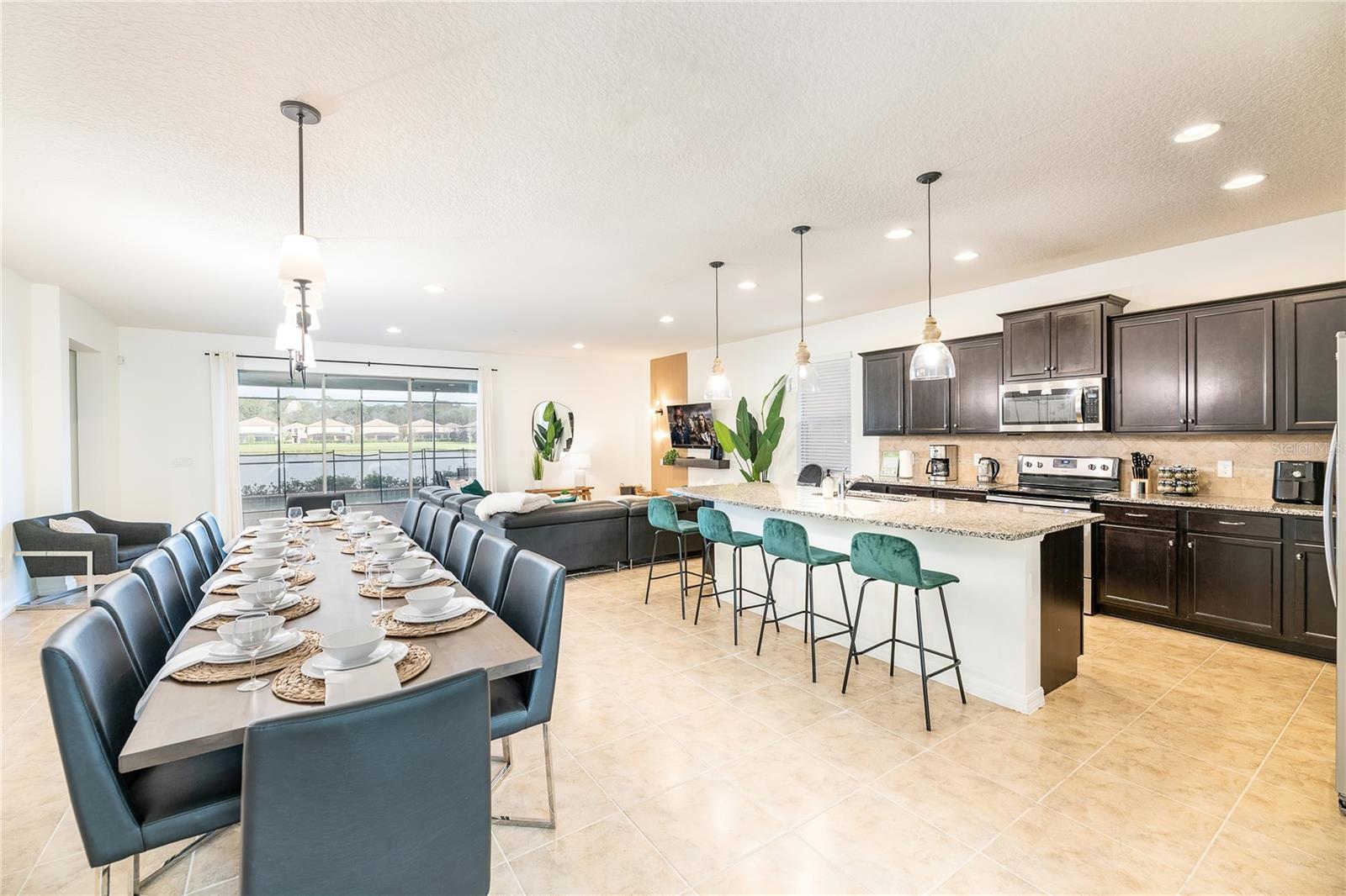 The interior features an open layout designed for high guest counts, with granite countertops, stainless appliances, tile flooring in main areas, and upgraded lighting. The home comes professionally furnished and guest-ready, reducing startup costs and downtime for the next owner.