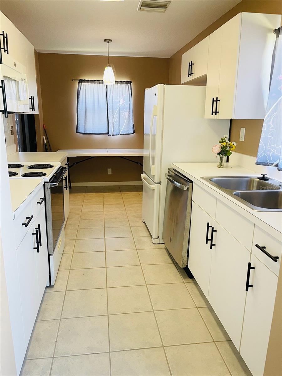 Full size kitchen with electric range, microwave, dishwasher and refrigerator included. Flooring is a practical mix of ceramic tile and laminate.