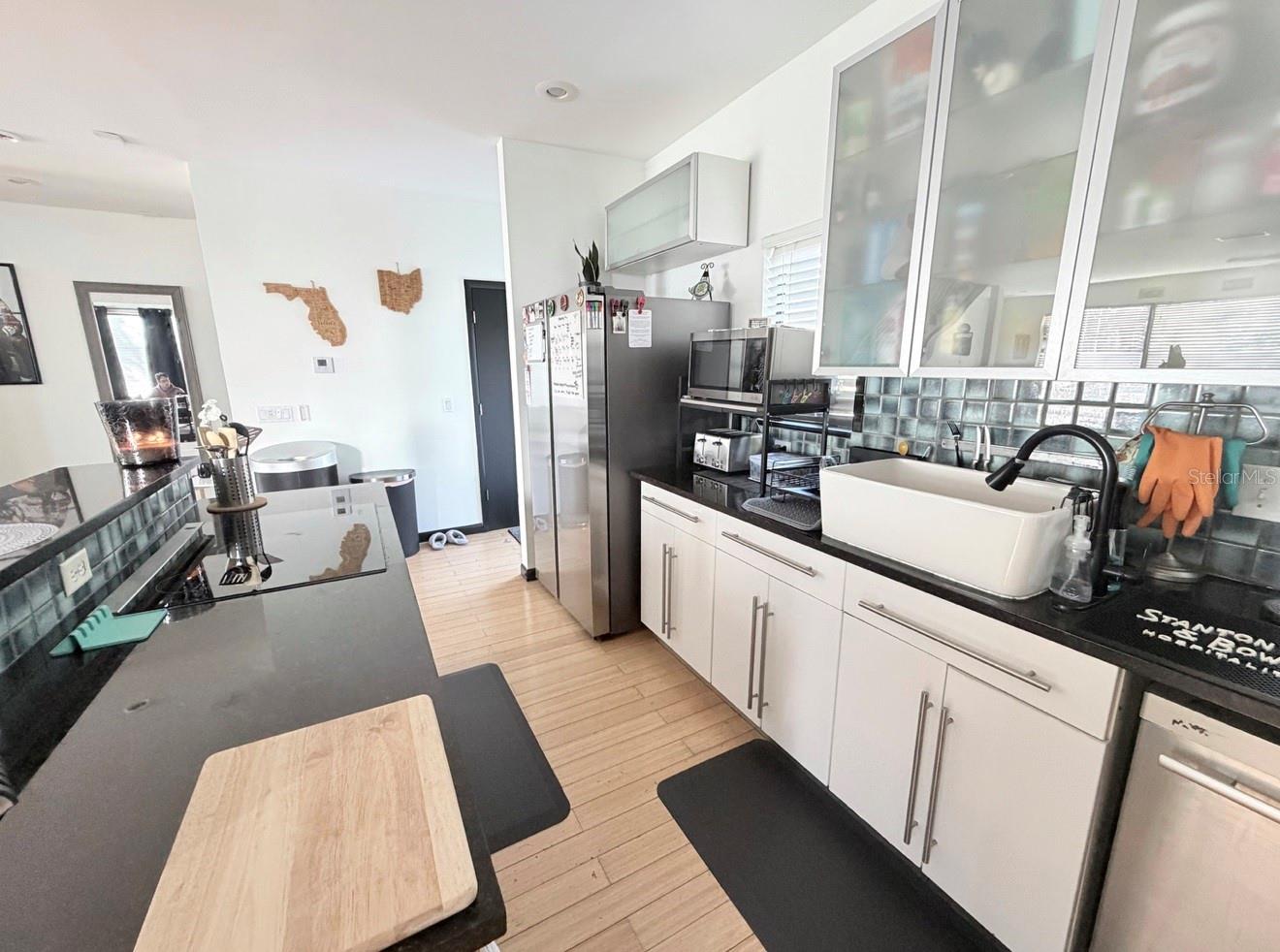 The modern kitchen is equipped with recently upgraded appliances, including a Samsung range with induction cooktop, Bosch dishwasher, Danby 36-bottle wine chiller (2023), and Samsung side-by-side refrigerator, washer, and dryer (2025). A new HVAC system installed in 2022 provides added peace of mind.