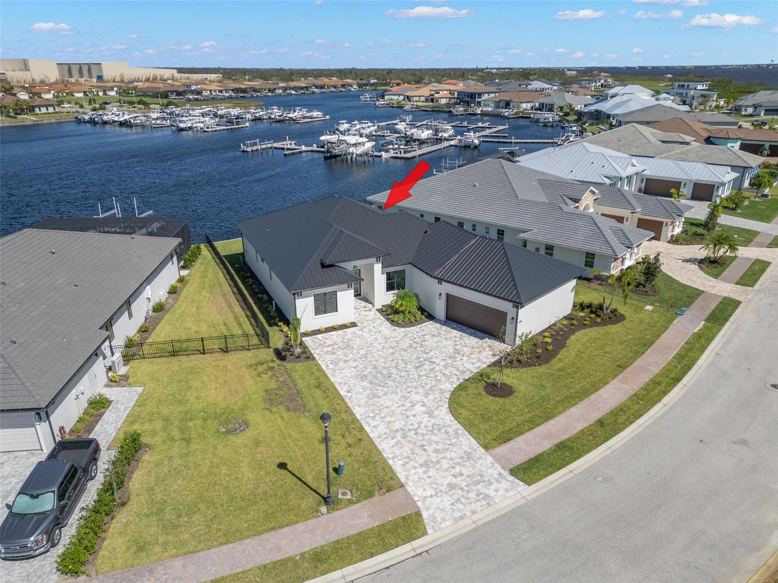 overlooking the peaceful waters of the marina basin. The waterfront Primary Suite has an ensuite bath with two vanities, private water closet, a stunning walk-in shower and a huge custom closet. Each of the guest suites have ensuite baths and custom closets. The kitchen has gorgeous café appliances; natural gas range, island sink and dishwasher, refrigerator, a built-in under-counter microwave and wine chiller. The powder bath and a large laundry room are on either side of the kitchen. Florida living is all about the outdoor space. This home has a covered lanai with al fresco kitchen making entertaining a dream. The gated community of Sanctuary Cove includes a Private