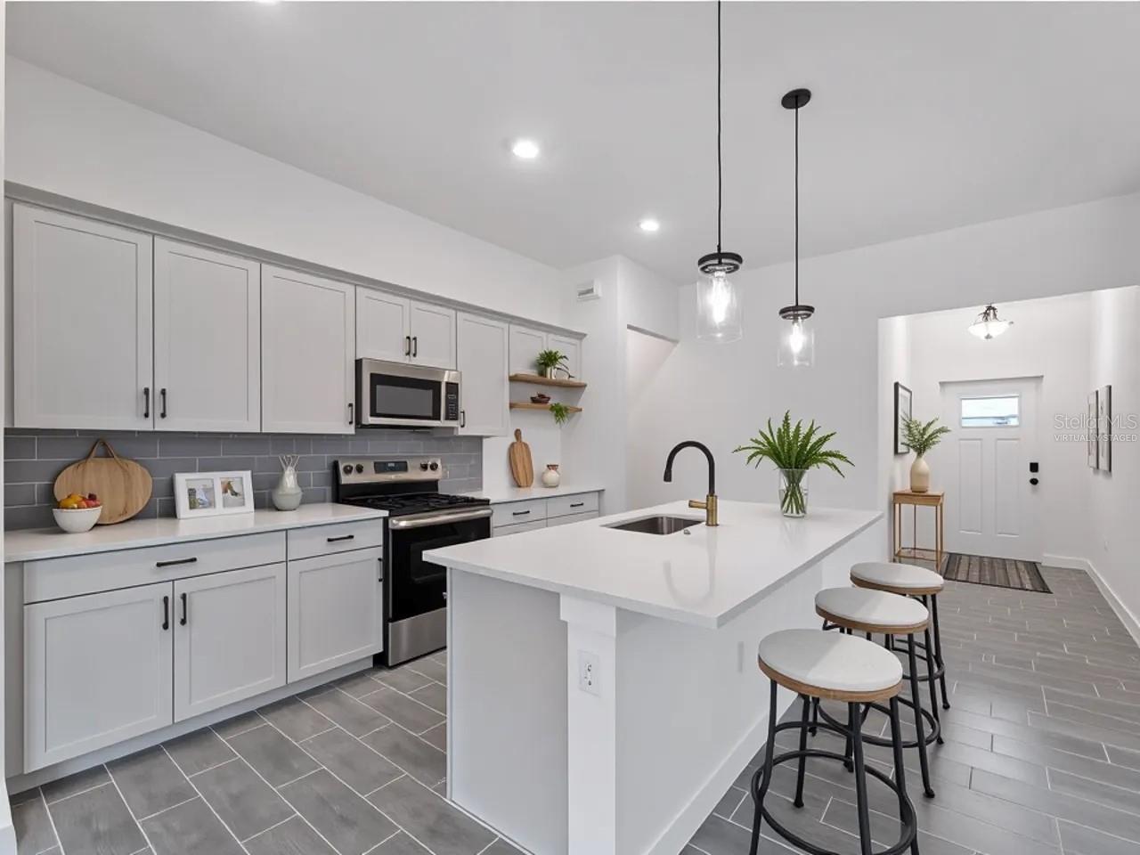 Kitchen with Quartz Countertops: The modern kitchen boasts durable and stylish quartz countertops, offering both beauty and functionality for your culinary adventures.