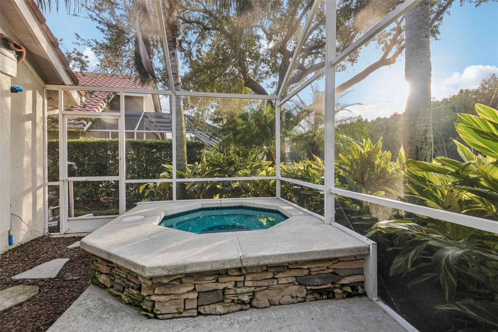 Outdoors, enjoy tranquil evenings on the expansive lanai with an in-ground hot tub, lush landscaping, and beautiful pond and golf course views—perfect for sunsets. It’s not uncommon to see deer and other wildlife from the lanai, adding to the serene and natural setting. A new roof was installed in October 2025, and the HVAC system includes a 2-year warranty with a freshly replaced ultraviolet bulb in 2025 for improved air quality and peace of mind.