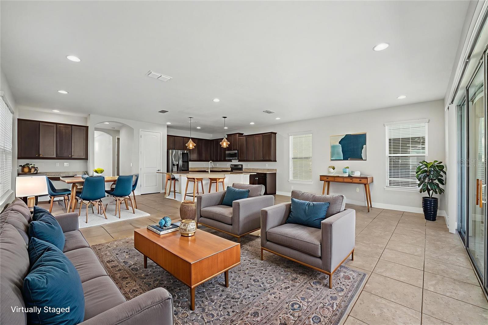 The spacious main level features a private bedroom suite, a convenient half bath for guests, and an expansive living and dining area that seamlessly connects to a stylish, oversized kitchen. Large sliding doors open to your own private POOL and SPA, creating the ultimate indoor-outdoor Florida lifestyle experience.