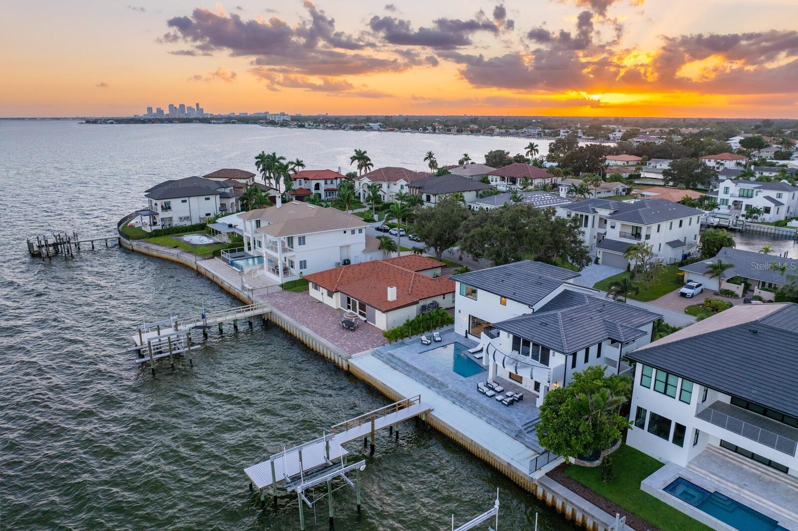 Exquisite Move-In-Ready Waterfront Masterpiece! Elevated and no flooding in recent storms, this house redefines St. Petersburg waterfront luxury. This contemporary gem blends bold architectural design with refined, inviting interiors, showcasing 90ft of panoramic open-water views. Features 4 upstairs bedrooms, including a luxurious primary suite with unrivaled water vistas, plus 2 first-floor bedrooms (one perfect as a guest or secondary primary suite). The outdoor haven boasts a brand-new 2025 dock, refreshed pool and decking, new 2025 outdoor grill, updated seawall, new 2025 slate roof, gutters, and soffits, and meticulously curated landscaping. Inside, expansive windows flood open-concept spaces with natural light, highlighting sleek contemporary finishes and effortless indoor-outdoor flow. Equipped with dual 2020 Trane HVAC systems and two 2017 tankless water heaters for ultimate efficiency. Just minutes from vibrant downtown St. Petersburg, this home epitomizes sophisticated St. Pete waterfront living. Ready for you to move in and enjoy the Florida lifestyle!