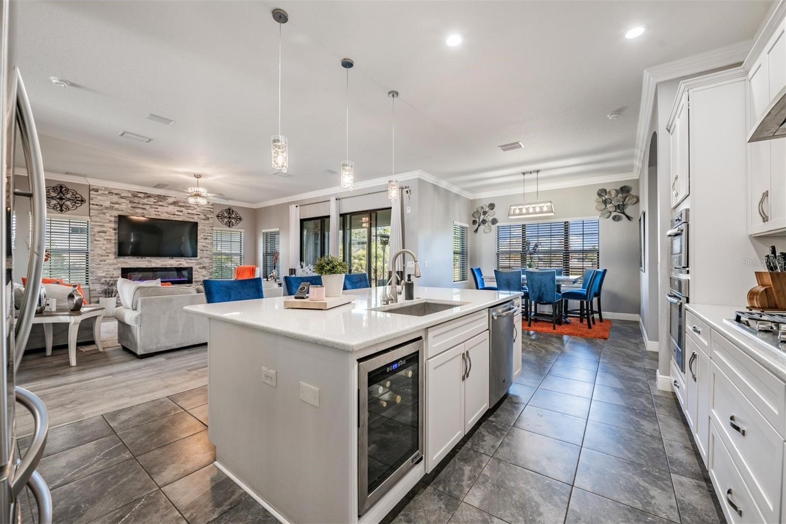 The chef-inspired kitchen features Quartz countertops, stainless steel appliances, gas range, tile backsplash, a huge center island with breakfast bar, spacious walk-in pantry, dedicated coffee station, and a large eat-in dining area, all flowing seamlessly into the main living space for easy entertaining.
