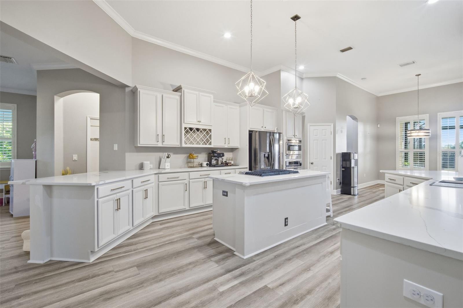 - Interior Features: Built-in Features, Ceiling Fans(s), Crown Molding, Dry Bar, Eat-in Kitchen, High Ceilings, Kitchen/Family Room Combo, Open Floorplan, Primary Bedroom Main Floor, Solid Wood Cabinets, Split Bedroom, Stone Counters, Thermostat, Tray Ceiling(s), Walk-In Closet(s), Window Treatments
