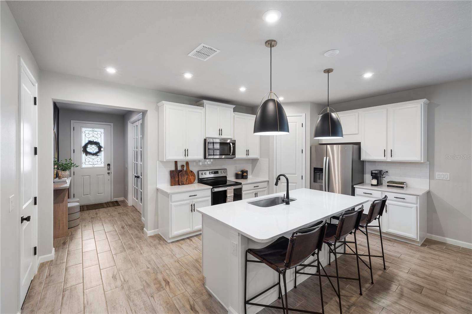 $10,000 PRICE IMPROVEMENT! Enjoy peace of mind knowing FLOOD INSURANCE is NOT REQUIRED on this designer home. Built in 2022, this 3 BEDROOM plus DEN, 2 BATH home in Renaissance at WELLEN PARK offers nearly 2,000 SQFT of stylish living and thoughtful upgrades. Inside, you’ll find wood-look TILE floors, QUARTZ counters, stainless appliances, a tile backsplash, an oversized island with custom molding, and a walk-in pantry with shelving. Details like PLANTATION SHUTTERS, board-and-batten accents, CUSTOM CLOSETS in every room, and cabinetry in the laundry and garage elevate the design. The SCREENED LANAI with TV and fan overlooks the FENCED BACKYARD, perfect for relaxing or entertaining. The primary suite includes a massive walk-in closet, dual sinks, and a walk-in shower. Fresh mulch and a sealed driveway add to the curb appeal. Low HOA covers lawn care and access to resort-style amenities: pool, gym, pickleball, tennis, clubhouse, and a lakefront fire pit. All just minutes from downtown Wellen Park, CoolToday Park, shopping, dining, and Venice beaches.