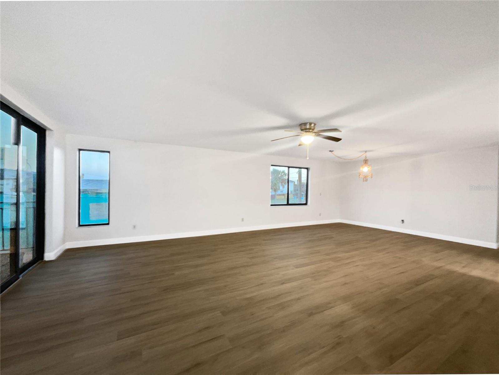 This light-filled home features an open floor plan with floor-to-ceiling windows, luxury vinyl plank flooring, and granite countertops throughout. The spacious primary suite offers a private en-suite bath, while the second bedroom includes direct access to the main bathroom. A generously sized laundry room with a utility sink adds extra convenience.