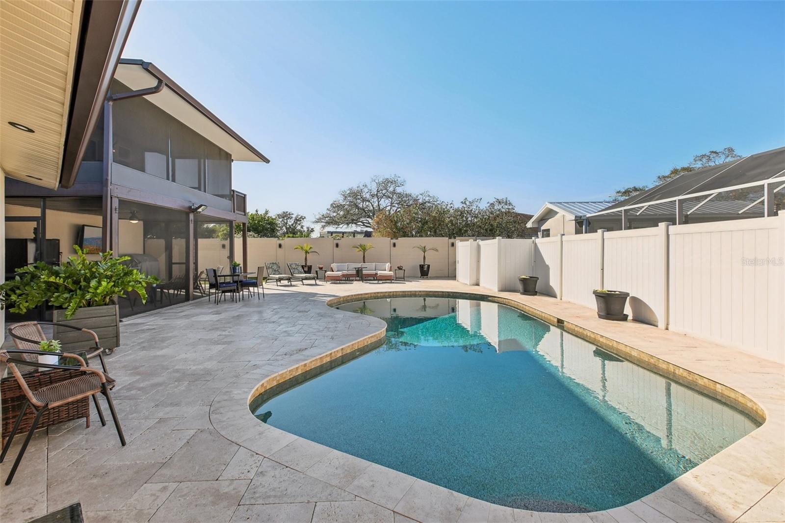 You will be delighted with the impeccable condition of this beautifully remodeled home with 4 bedrooms, 3 full baths + 1/1 guest house and as assumable Flood Insurance Policy! Light and bright throughout, this home has been upgraded with the utmost attention to detail and quality materials that include new porcelain tile flooring throughout, custom interior doors, new kitchen and bath cabinetry, bespoke natural quartzite countertops, designer paint finishes +++ Step through the front door into the dining area and oversized great room. The impressive oversized center island with stone countertops is the focal point of the kitchen. The stainless appliances are GE Café series and include a gas range. Adjacent to the kitchen is the walk-in pantry that contains the second refrigerator and an abundance of pantry shelving. The 4 bedroom layout is a split plan, with the master suite privately located on the east side of the home with a large bathroom offering a walk-in shower and separate soaking tub, custom built cabinetry, beveled glass mirrors and oversized custom built his and her closets. Down the hall from the kitchen are the remaining 3 bedrooms, one with its own ensuite bath and another oversized full bath in the hall with double sinks that is available for the 2 other guest bedrooms. Step outside to the beautiful pool area and the detached 2 car garage plus guest quarters. The garage has epoxy flooring, an A/C and heat unit and an attached screened porch overlooking the pool. Upstairs over the garage is a completely updated GUEST QUARTERS that you enter by its own separate private entrance. At the top of the stairs, you pass through the screened porch into the 625 sf air conditioned living space just perfect for guests, extended family OR make this an income producing AirBNB. This unique bonus space has a full bath, mini-kitchen, washer and dryer and a flexible floorplan. You will love enjoying the low maintenance fully fenced backyard. The large, deep pool has been resurfaced with Pebble Tech and new travertine coping and deck pavers. Walkable to the Tampa Bay MARINA for the BOATING Enthusiast. So many upgrades and features including10-camera Ring security system covering entire property perimeter, main house AC system (both handler and compressor) less than two years old and the entire home and garage has newer roofing and gutters. This is truly a move-in ready home!