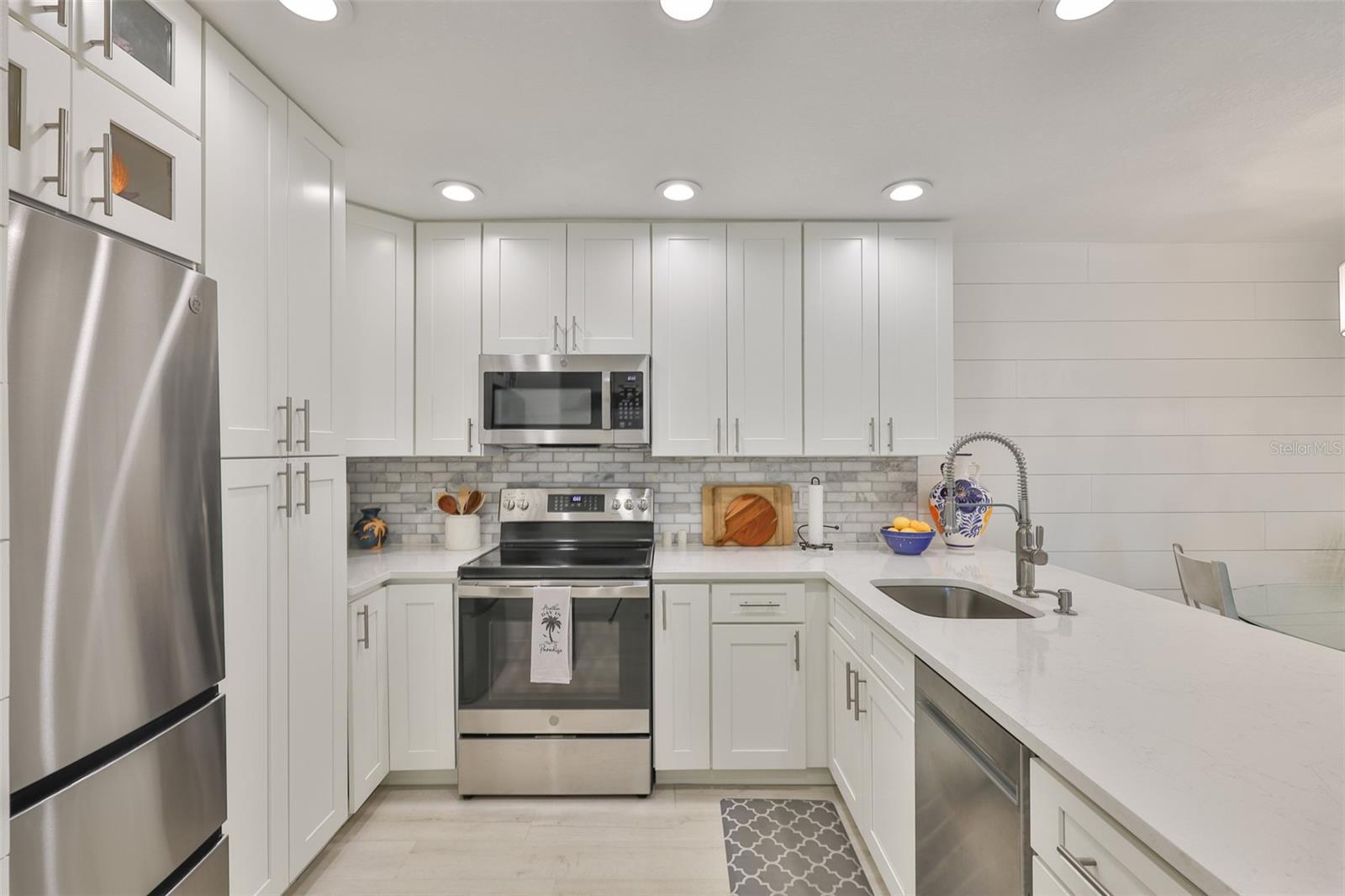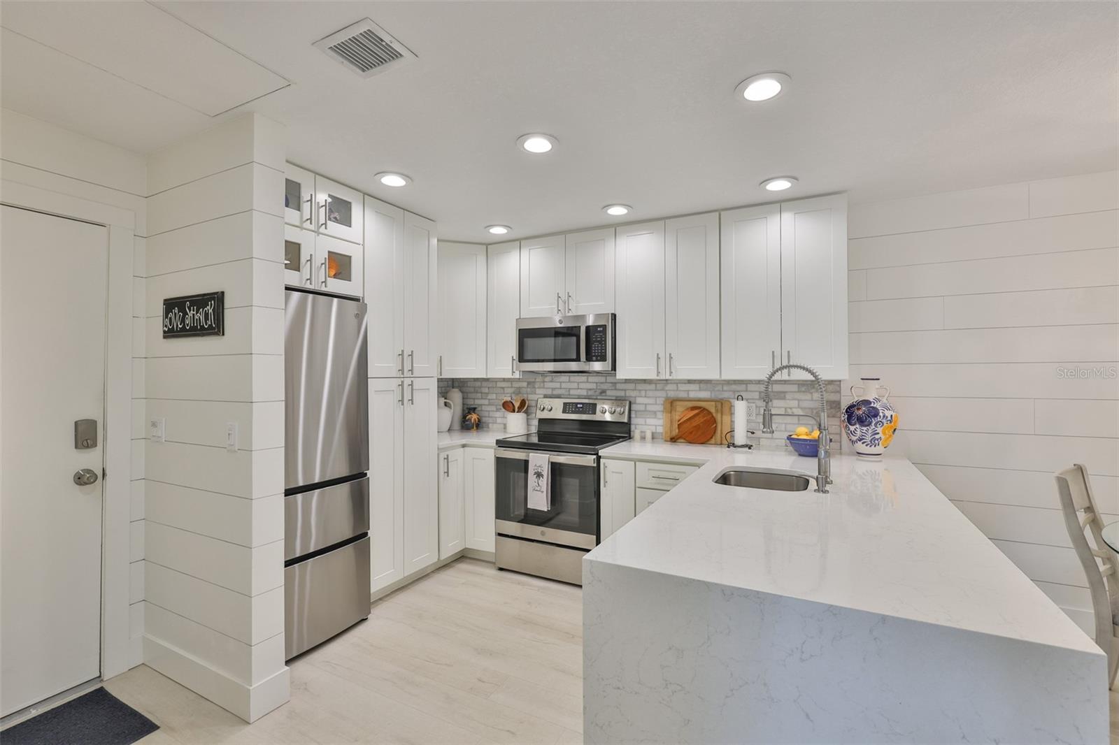 Meticulously remodeled and thoughtfully redesigned, this bright open concept and stylish 2-bedroom, 1-bath second-floor unit offers refined coastal living just 50 steps from the white sands of Madeira Beach. The open-concept layout lives larger than expected, featuring a stunning designer kitchen with waterfall-edge, quartz countertops, soft-close cabinetry, roll-out trash, lazy Susan, pantry, and premium stainless-steel appliances (all 3 years new). The kitchen flows seamlessly into the spacious living and dining area, extending to a serene screened-in balcony lanai. The primary bedroom includes a custom California-style walk-in closet, while the Jack & Jill bath features quartz counters and a beautifully tiled shower stall. Additional upgrades include tiled shower stall. Additional upgrades include: 2025 New CARRIER HVAC SYSTEM (AIR HANDLER & CONDENSER), Condenser and electric raised to current bldg. code, 2021 windows, all-new 2021 windows, all-new drywall under the chic stylish shiplap, R30 attic and R5 wall insulation, 100-amp electrical panel w/ all new breakers, attic access above entry, and stacking washer/dryer. Located in a secure, gated community with two heated pools, jacuzzi, clubhouse, gym, billiards room, fishing piers, and walking paths. Just a short walk to ROC Park, the library, shopping plaza w/ grocery store, restaurants, walk to entertainment and the world-famous John?s Pass. Beach trolley and city bus are steps away to explore. Whether a full-time residence, vacation retreat, or high-performing short term (7 day minimum) rental, this turnkey opportunity offers exceptional value and coastal convenience. Schedule your private showing today. Chandelier does not convey.