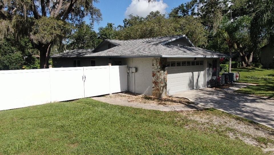 Presenting a stunning home now available in the desirable Woodbend Subdivision. Residents of this community often put down roots, creating a lasting sense of belonging. This forever home is situated on 0.55 acres of land, securely positioned in a non-flood zone. As you enter through the generous driveway, offering ample parking, you are welcomed by a charming front porch, perfect for enjoying tranquil mornings or relaxing evenings. Stepping inside, you are greeted by a warm and inviting ambiance. The living room features hardwood flooring, providing plenty of space for comfort and entertaining, complemented by a striking double-sided fireplace that adds a unique flair. Each bedroom is equipped with its own walk-in closet and private bathroom, showcasing oversized vanities and custom countertops. The master bathroom offers dual access, with entries from both the master suite and the hallway. The farmhouse-style kitchen boasts granite countertops and includes appliances, along with an island/breakfast bar ideal for casual dining and entertaining. The adjoining dining room provides additional space and seating, all while enjoying the view of the double-sided fireplace. A pantry is available for storing non-perishable items, and the two-car garage features a convenient entrance that leads to a laundry/mudroom. From the living room or dining area, sliding doors provide access to a delightful Floridian back porch, creating an ideal space for relaxation or hosting gatherings. The back porch opens to your personal oasis, where you can immerse yourself in nature, cultivate a garden, or grill under the gazebo, surrounded by an array of pineapple bushes and banana trees, offering the joy of homegrown organic fruits. The backyard includes three sheds: a 17'x22' workshop with electrical access (110–220 volts, lighting, and concrete floor), a 12'x22' storage/shop (electric 110v, lighting, concrete, and safety flooring), and a 10'x10' lawn equipment storage shed (electric 110v, one light). The property is equipped with a well pump sprinkler system featuring ten zones and is enclosed by a fence with two access vinyl fence gates. Recent updates include a full roof replacement completed on January 21, 2020; popcorn ceiling removal on September 16, 2020; a new HVAC system installed on April 15, 2021; new windows added in February 2022; a new water heater on August 27, 2023; septic tank servicing on February 7, 2025; and a four-point inspection conducted on June 23, 2025. Woodbend Subdivision is a no outlet community with only one entrance and exit, ensuring minimal through traffic and a peaceful atmosphere. Conveniently located near Seven Springs and Trinity, you enjoy easy access to essential amenities while maintaining a sense of spaciousness without overcrowding. Woodbend Subdivision HOA is Voluntary. Schedule your showing today!