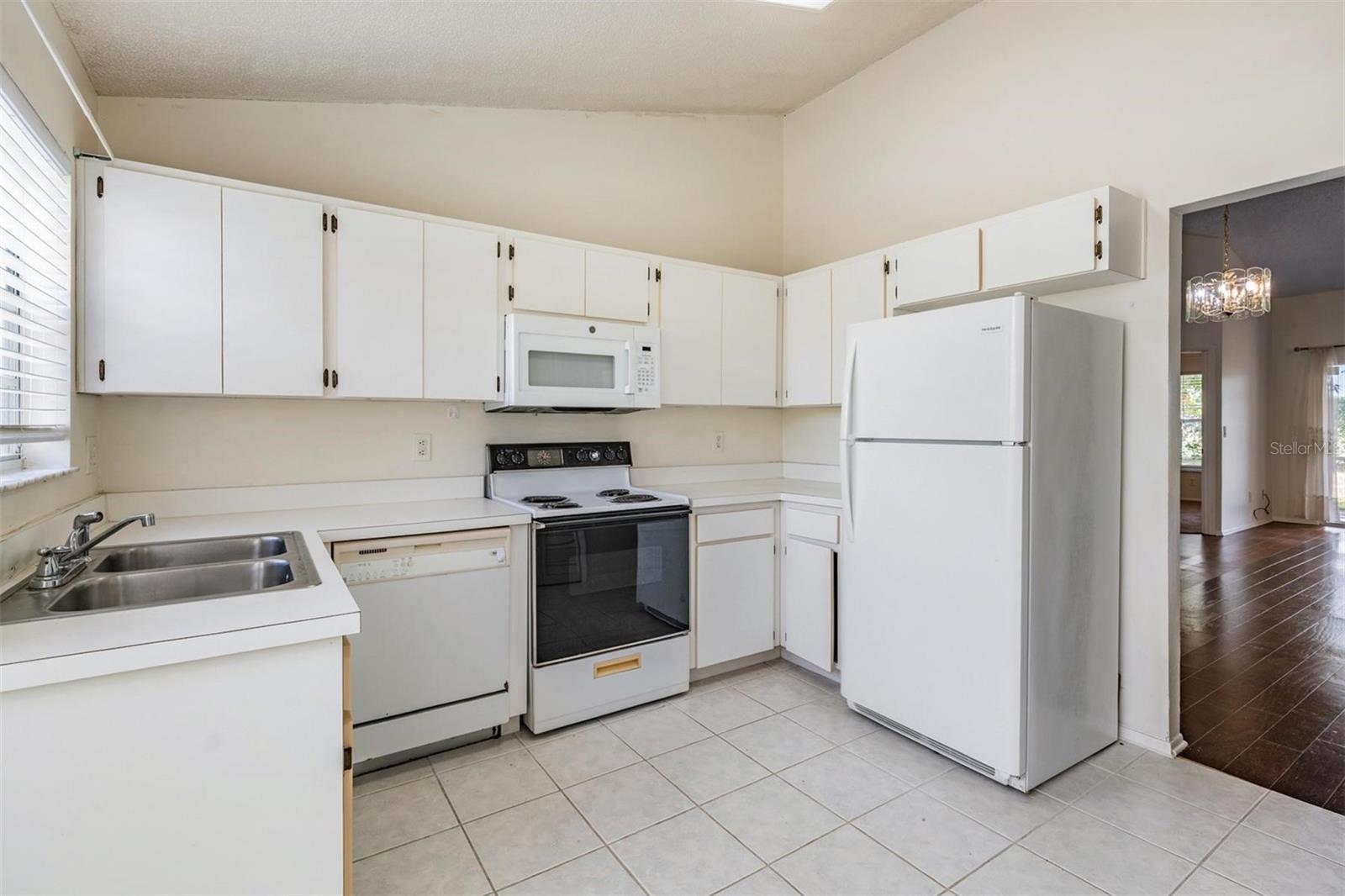 Step inside to soaring vaulted ceilings and a bright, open Great Room with living and dining space. The kitchen is positioned up front with a cozy eat-in nook, while the split-bedroom plan offers privacy. The spacious primary suite features a large walk-in closet and ensuite bath, tucked away at the rear of the home. The secondary bedroom is up front near the hall bath, along with a convenient laundry closet with washer and dryer included.