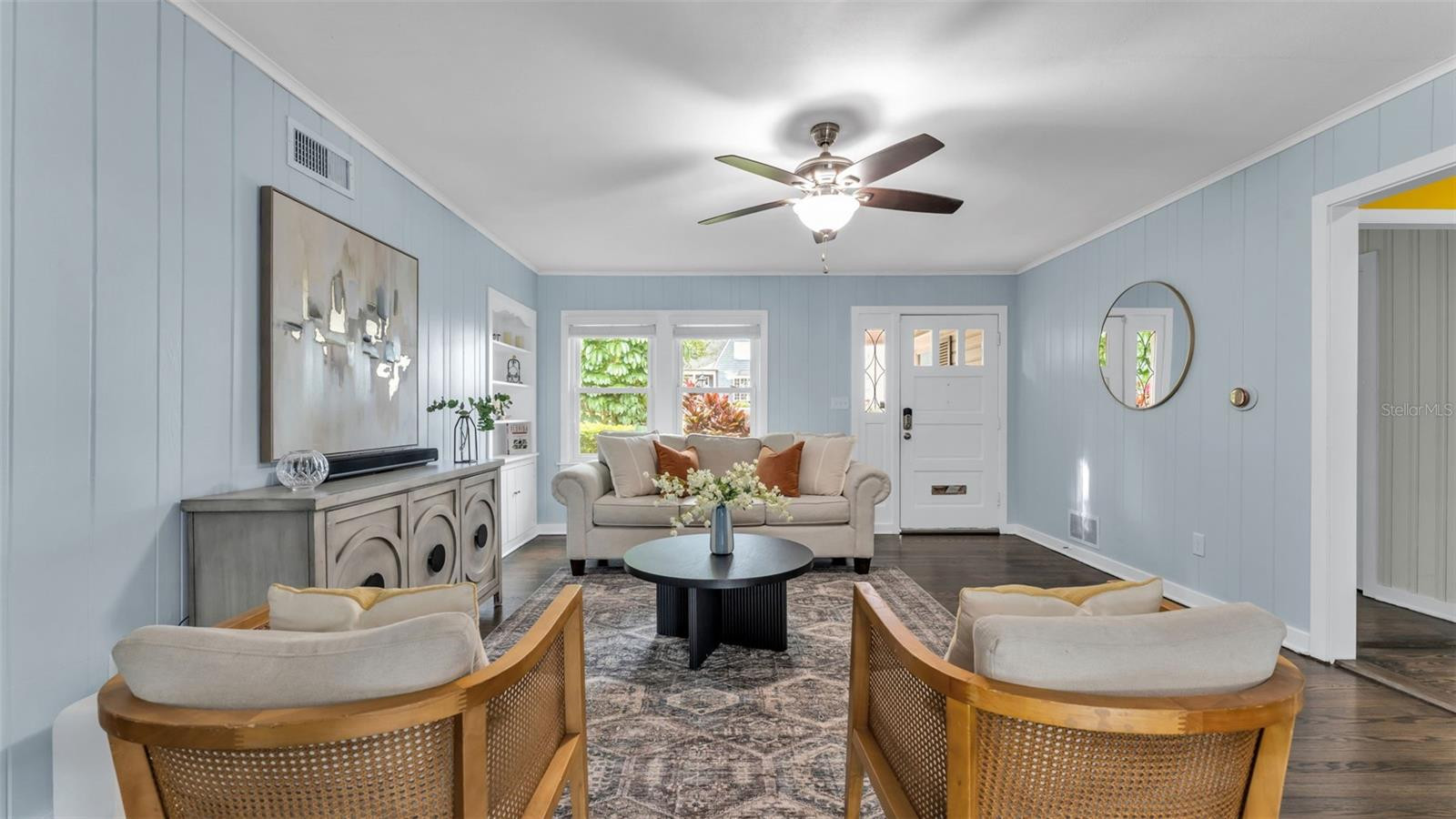 The living room is bright and open, with a skylight and windows overlooking the patio and pool. Built-in shelving adds charm and storage, while the layout makes it easy to enjoy both quiet mornings and lively gatherings.