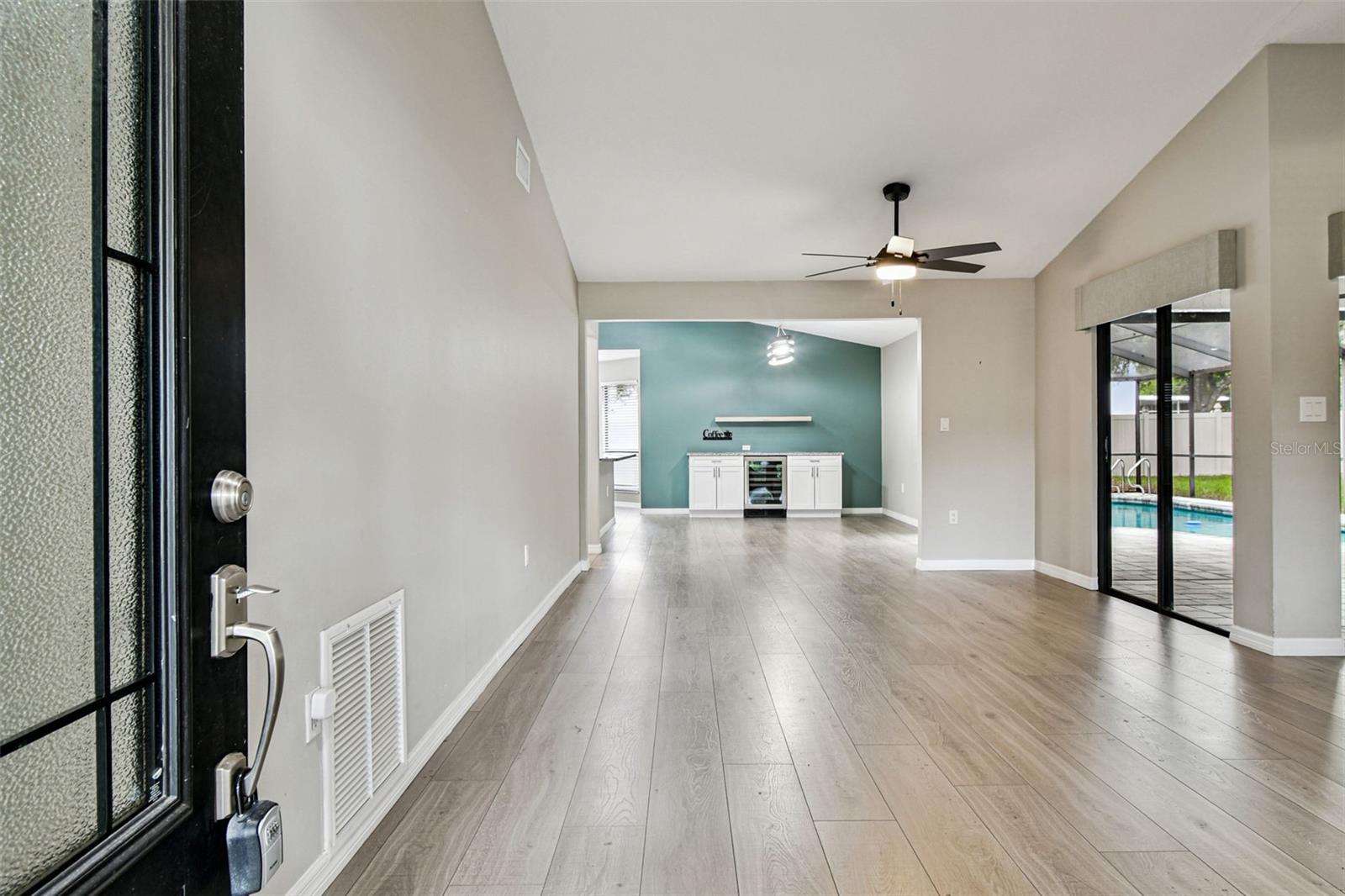 patio drainage. Inside, the open split floor plan boasts vaulted ceilings, luxury vinyl flooring,