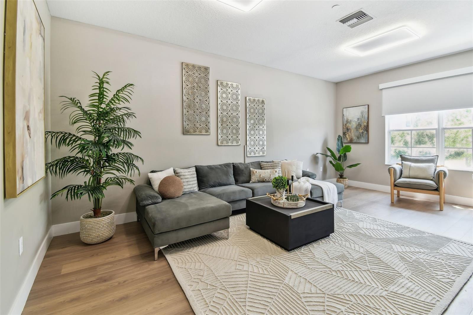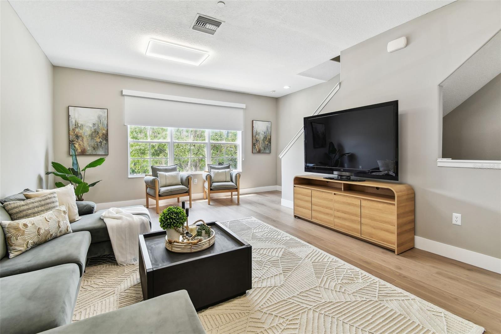 The gourmet kitchen has been completely transformed with brand-new appliances, sleek cabinetry, and double-thick stone countertops that extend into a stunning waterfall-edge island—a true focal point for entertaining. Overhead, new LED lighting in the great room brightens the heart of the home, making the second-floor living space as welcoming as it is functional.