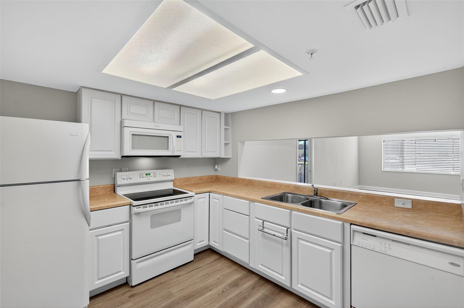 One or more photo(s) has been virtually staged. Move-in ready and beautifully maintained, this 2-bedroom, 2-bath first floor condo offers 1,105 sq ft of comfortable living in the heart of Clearwater. Fresh neutral paint, updated flooring, double lanais, and in-unit laundry make everyday living a breeze. The kitchen features crisp white cabinetry and a convenient pass-through to the dining area, while the spacious living room flows to a screened patio with additional storage closet.