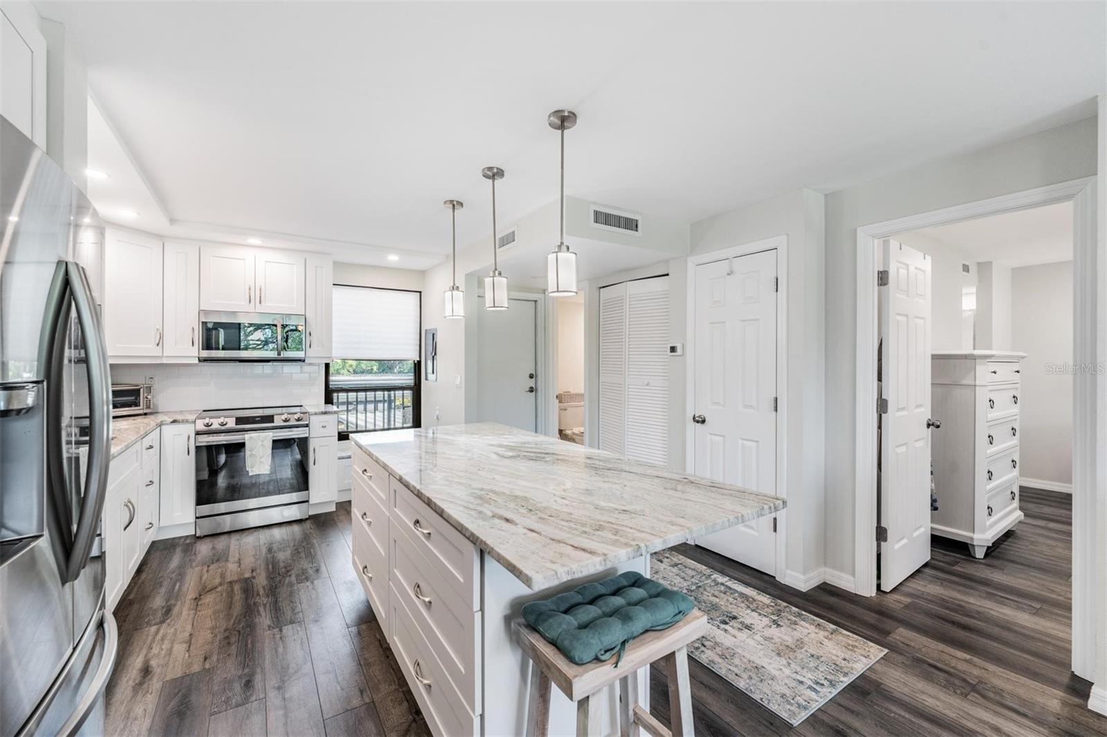 Welcome to your dream home in the heart of Cove Cay Village 2! This stunning, fully remodeled condo offers sweeping views of the pool, lush park-like grounds, and the golf course—blending resort-style tranquility with upscale living. Step inside and prepare to be wowed by a top-to-bottom renovation that leaves nothing untouched. The open-concept kitchen is a showstopper, anchored by a magnificent granite island that doubles as a storage solution, dining bar, and buffet station. Beautiful Shaker-style cabinets with soft-close doors and drawers are complemented by a chic subway tile backsplash, Samsung appliances—including a sleek drop-in range—and eye-catching pendant and LED ceiling lighting. Don’t miss the charming granite-topped window seat—perfect for sipping your morning coffee. New flooring flows throughout the unit, paired with smooth ceilings and built-in lighting for a clean, modern feel. The main bathroom features a spa-like glass shower, while the half bath echoes the same upscale finishes. All exterior windows have been upgraded to hurricane-grade, including the living room and enclosed porch (updated post-Hurricane Milton for peace of mind). The door to the porch is new in 2025 and the front door was replaced in 2020. An added A/C vent in the closet ensures comfort throughout, and the private laundry room boasts high-efficiency LG front-load washer and dryer. Upscale ceiling fans with remotes are another plus. The a/c and water heater were replaced in 2020, along with all new shut off valves to the water heater. Words cannot describe the beauty of this condo, but it is an absolute winner in every respect. And it is fully and beautifully furnished as well!! Along with lush landscaping throughout the complex, an 18-hole golf course with restaurant and bar open 7 days a week, a marina for all your boating aspirations, security and more, this is the Paradise Found known as Cove Cay.